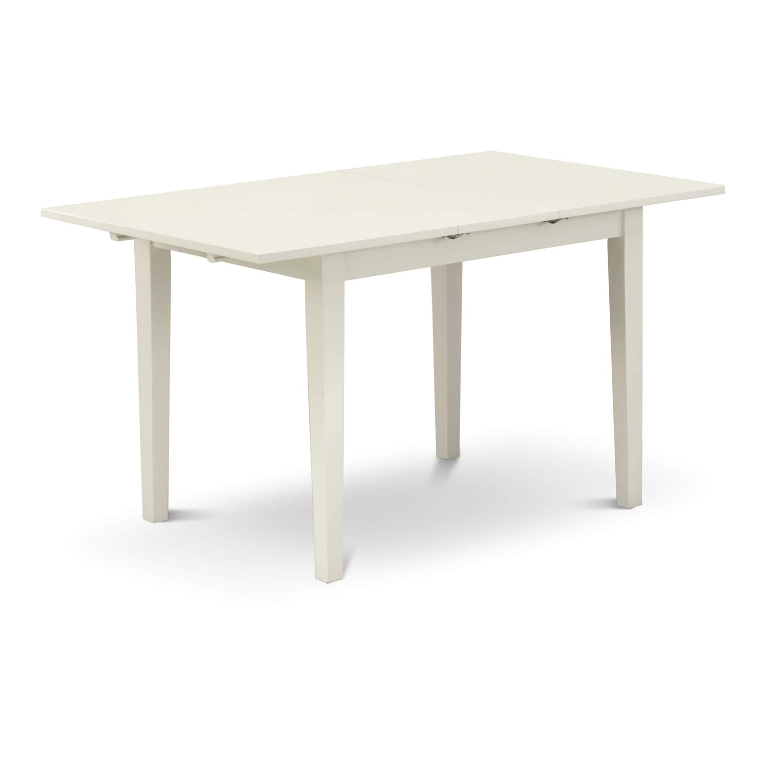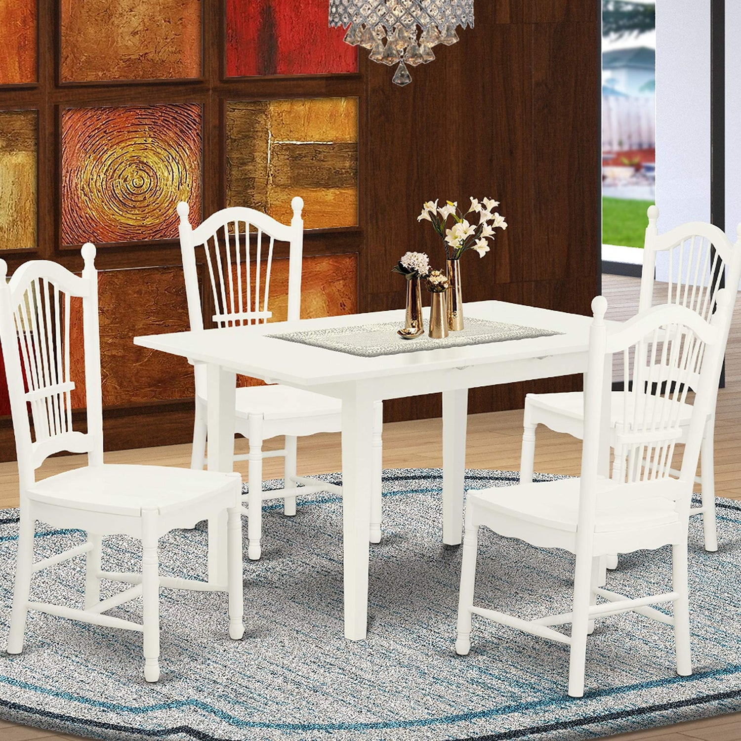 • EAST WEST FURNITURE 5-PIECE DINING ROOM TABLE SET WITH 4 ASTOUNDING WOOD DINING CHAIR AND RECTANGULAR TABLE WITH BUTTERFLY LEAFIts kitchen dining table set consists of 4 beautiful dining room chairs and an incredible 4 legs rectangle table. The dining room set provides a Linen White solid wood dining table and fantastic linen white wood dining chair that will boost the elegance to your dining room. This small Rectangular dining table is produced from high-quality rubber wood