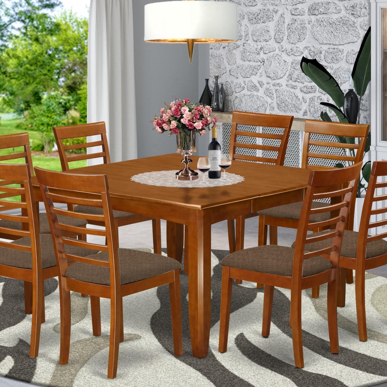 East West Furniture PFML9-SBR-C 9 Piece Kitchen Table & Chairs Set Includes a Square Dining Table with Butterfly Leaf and 8 Linen Fabric Dining Room Chairs, 54x54 Inch, Saddle Brown