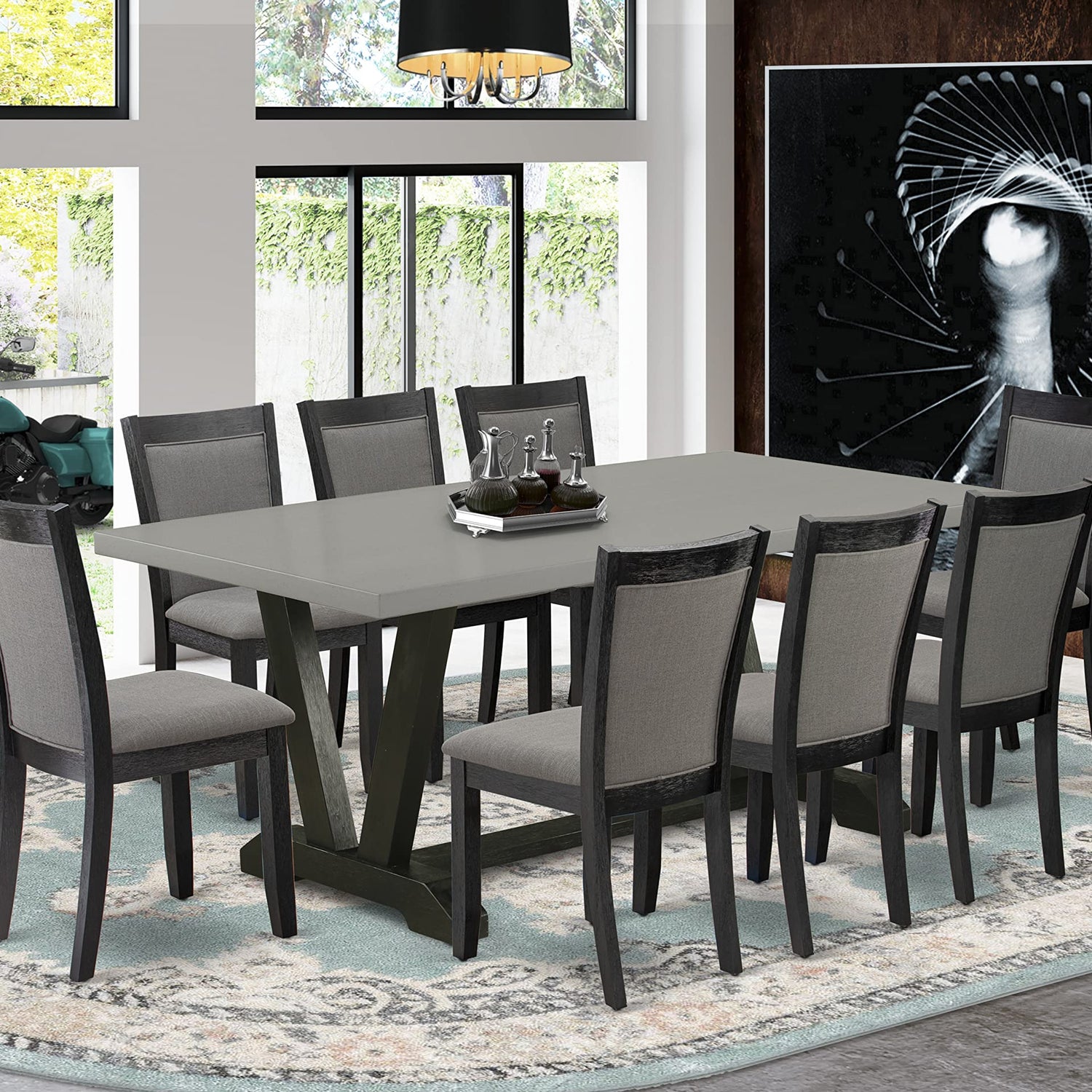• MODERN DINING TABLE SET FINISH: Delivering a polished and refined presentation, this dining table set exudes a sophisticated allure that elevates the modern ambiance of any dining room. The contemporary kitchen table showcases a Cement tabletop adorned with a Wire Brushed Black finish while the dining room chairs are impeccably finished in Wire Brushed Black, complemented by upholstery in Dark Gotham Grey Linen Fabric.