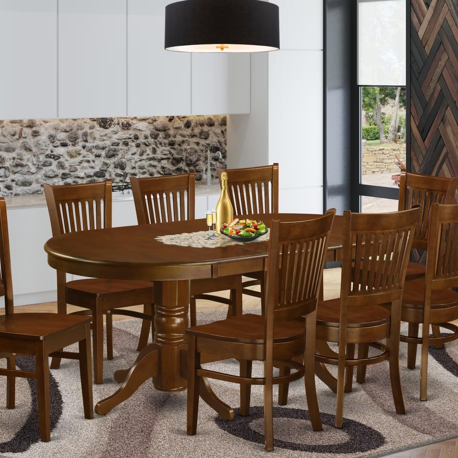 This 9-piece modern dining set includes 8 dining chairs and 1 butterfly leaf Modern dining room table. Our stunning dining table features an unalterable Espresso tabletop to Espresso Finish, offering enduring style. Its remarkable versatility complements any home design. Additionally, the Espresso-finished wooden legs and the relaxed mid-century chair design bring a touch of modern sophistication to any dining area. Our classic dining room table set is exclusively crafted from Asian wood, commonly known as rubber wood. The frame of this dining table set is constructed from top-quality wood, ensuring outstanding durability and stability. Its straightforward and innovative design makes it an ideal addition to any kitchen area. These kitchen chairs have a wooden seat, Slatted Chair Back and the dining table consists of an oval tabletop and double pedestal Legs. We have produced these modern dining chairs and the oval table with the help of highly experienced carpenters, who produce a smooth and high-end finish to this modern dining table set. We try to offer innovation as well as ease to assemble. This superior quality dining room table set is perfect for you and any dining area. This kitchen room set can be used for casual home parties or intimate gatherings.