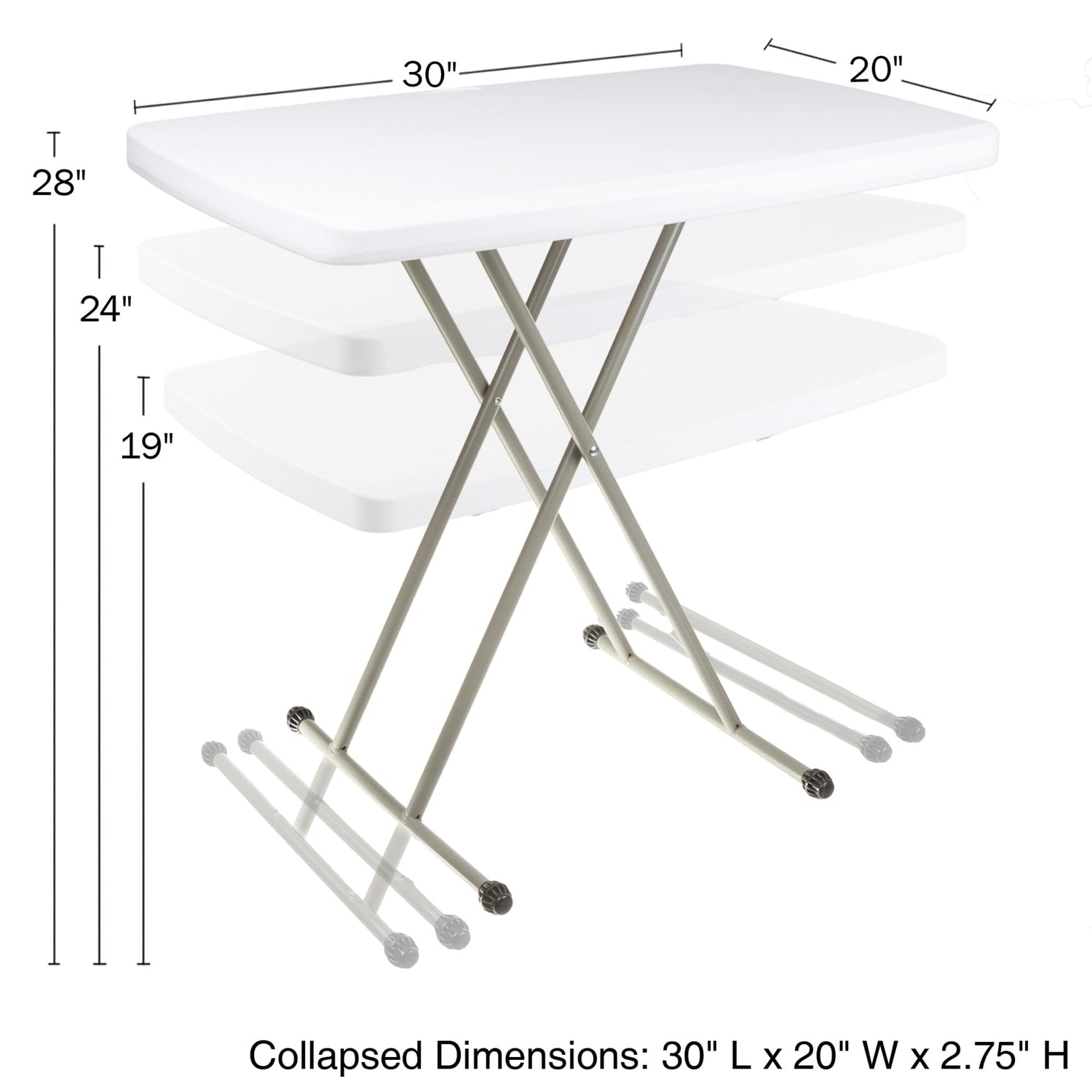 - TAKE IT ANYWHERE - The metal frame on this lightweight portable table is coated to resist stains, and the durable plastic top makes it suitable for both indoor and outdoor use. The adjustable table folds flat for easy transport and storage.