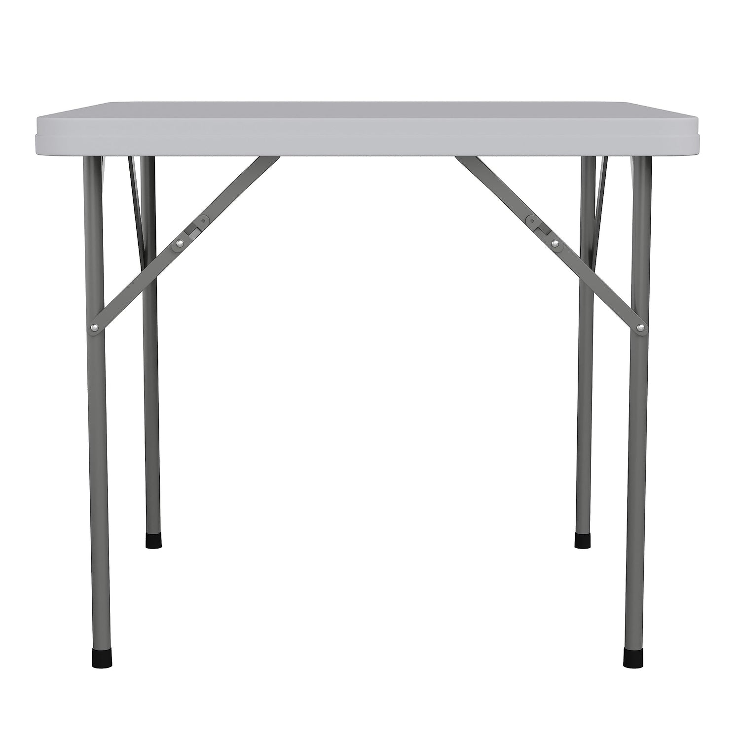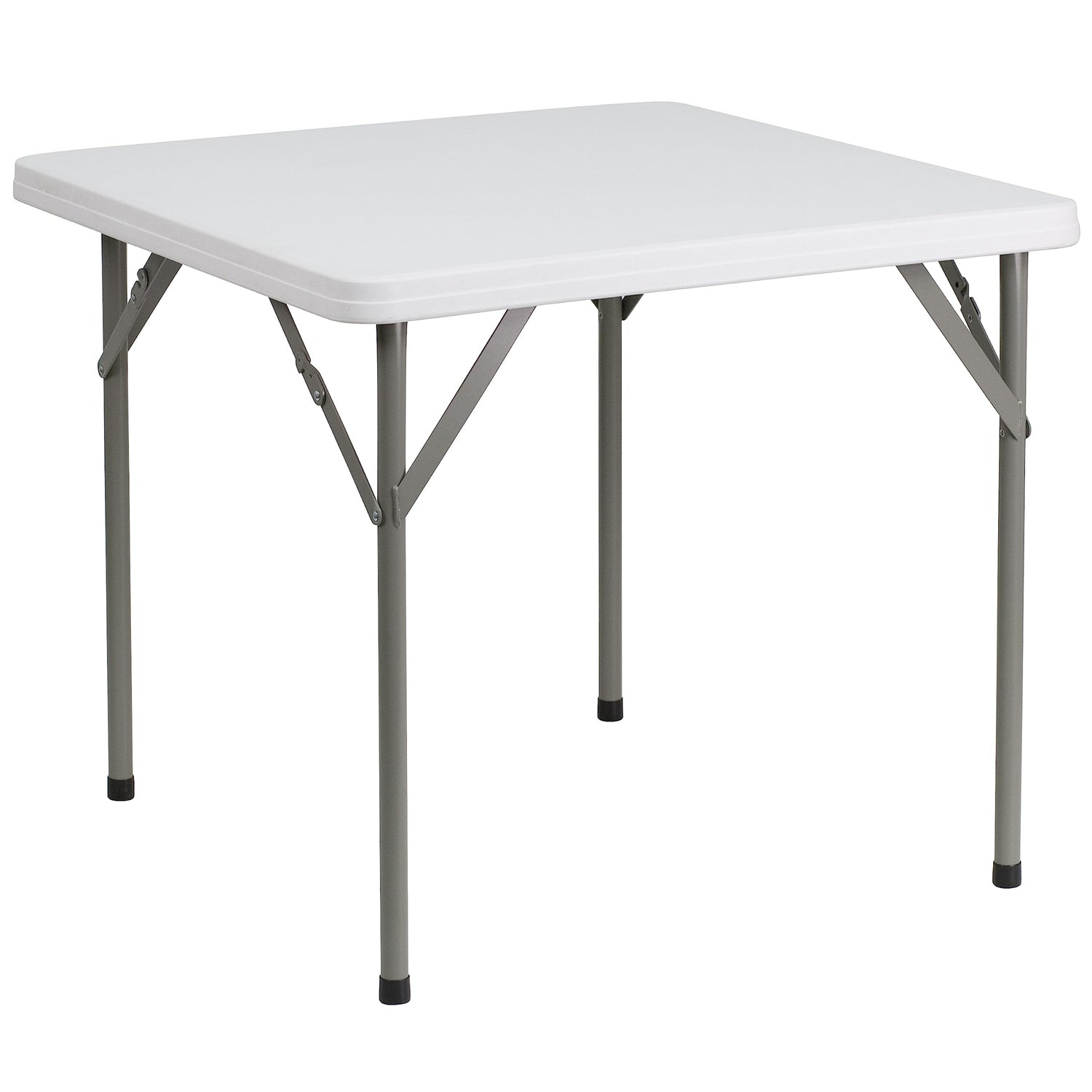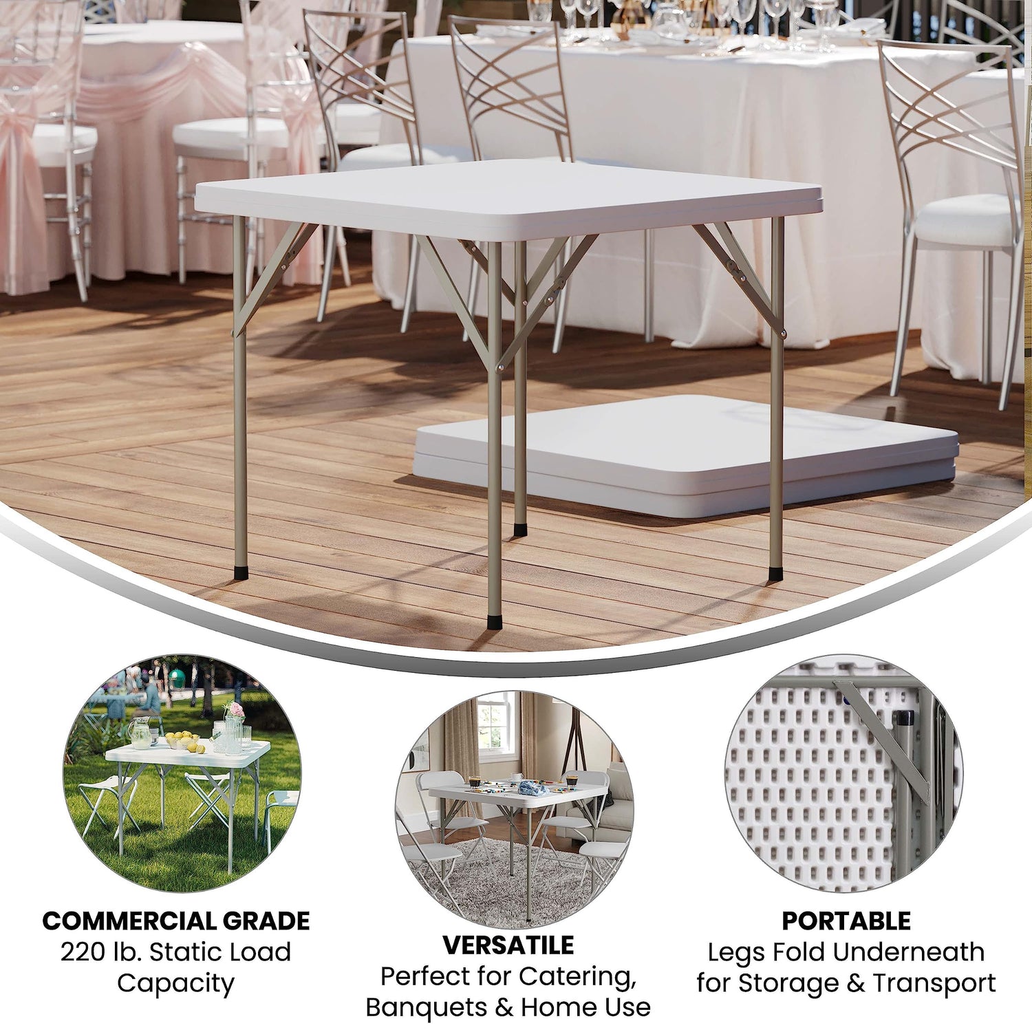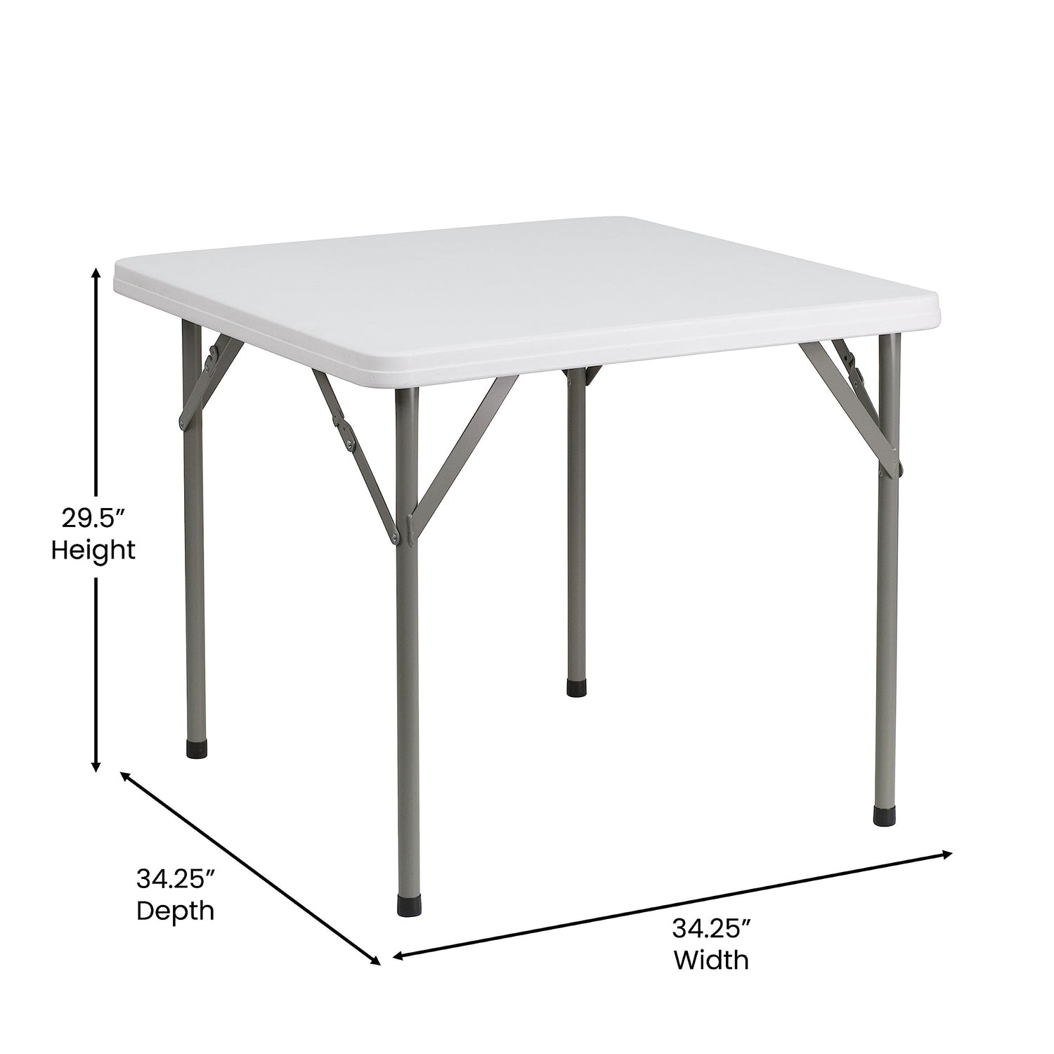 Details: Always be ready for your next event or get-together with the Flash Furniture Elon 2.85' Square Plastic Folding Table. Whether you're hosting an indoor or outdoor home, school, or business event, this white plastic table offers a reliable, on-demand solution for when you need a little extra surface space for your guests. It comfortably seats up to 4 people, making it great for a variety of settings such as parties, conferences, family barbecues, trade shows, corporate events, reception areas, training rooms, banquet venues, and much more. The convenient foldable design allows for easy transportation and compact storage after use, and the protective non-marring floor caps on the bottom of the locking legs prevent your flooring surfaces from damages while adding stability on uneven surfaces. Constructed with a 1.75" thick waterproof and impact and stain-resistant tabletop and durable gray powder-coated locking legs, this folding event table withstands years of quality use at indoor and outdoor events, and it can be used as is or dressed up with a tablecloth to achieve a custom look. This banquet table can support up to 220 pounds of static weight and measures 34.25"W x 34.25"D x 29.5"H with no assembly required. As needed, the low-maintenance table can be wiped down with a damp cloth for quick and easy cleaning.
