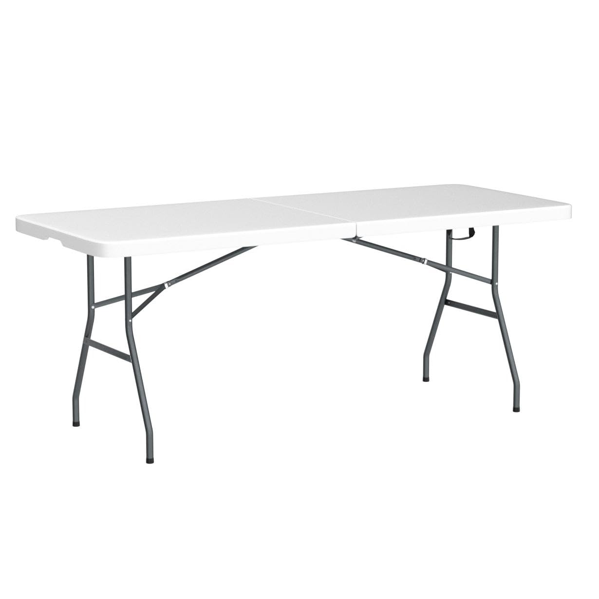 - Easy Set Up & Sleek Design - No assembly required. Designed in a simple structure, this fold-in-half camping table is easy to set up, saving you much time and effort. What’s more, the white minimalist design makes this centerfold table perfectly blend in with any scene. In addition, the stain-resistant and waterproof tabletop makes cleaning a breeze.