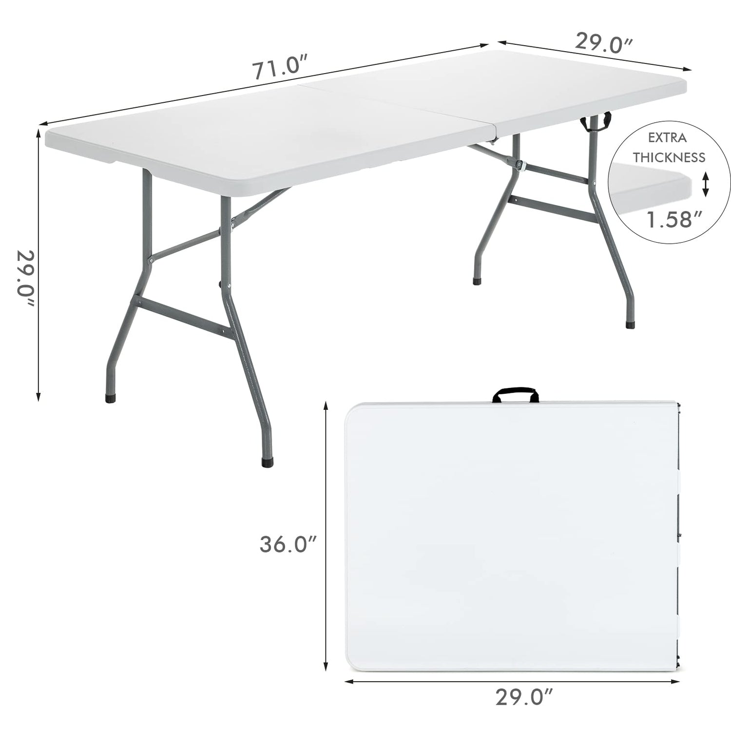 - Large Tabletop for Family Meal - The rectangular 1.58 inch thick desktop measures 71”(L) x 29”(W), providing spacious space for holding foods, desserts, drinks, or snacks. This folding table can accommodate about 8 people to gather around for a family meal or party dinner. And all corners of the table top are rounded to prevent accidental injury.