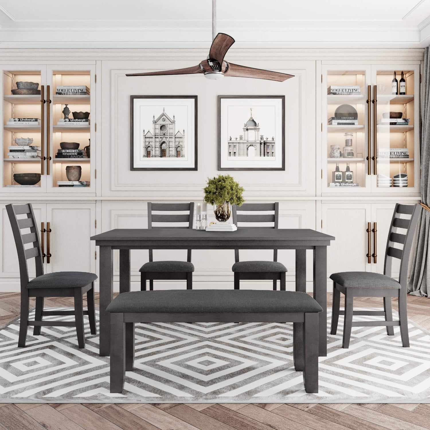 Harper & Bright Designs 6 Pieces Wooden Dining Table Set, Rectangle Table and 4 Chairs with Bench with Cushion, Kitchen Table Chairs Set for 6 Persons, Dining Room Set (Gray)