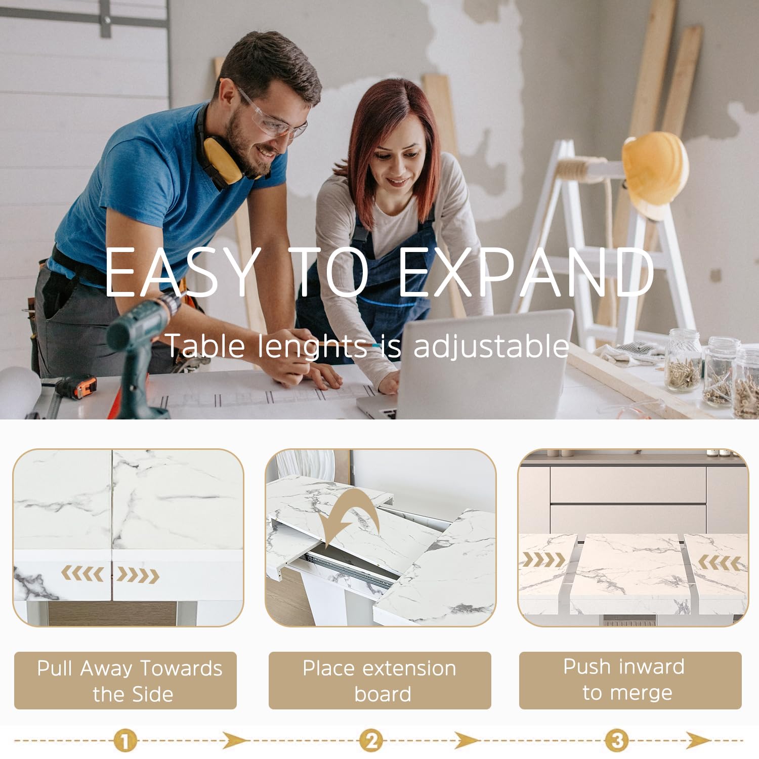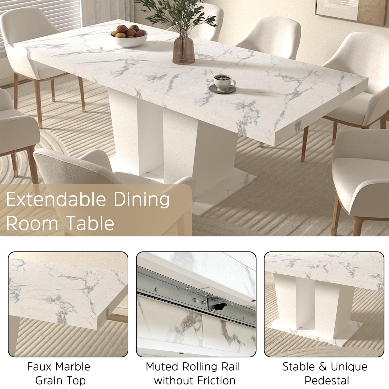 - 【Extendable Dining Table Set】This magic dining set comfortably seats 4-10 guests, which includes a extendable dining table and 8 chairs.The white marble grain tabletop style and the unique white frame's clean lines make dining table a versatile addition to the kitchen, dormitory, living room, study room, office and meeting room.