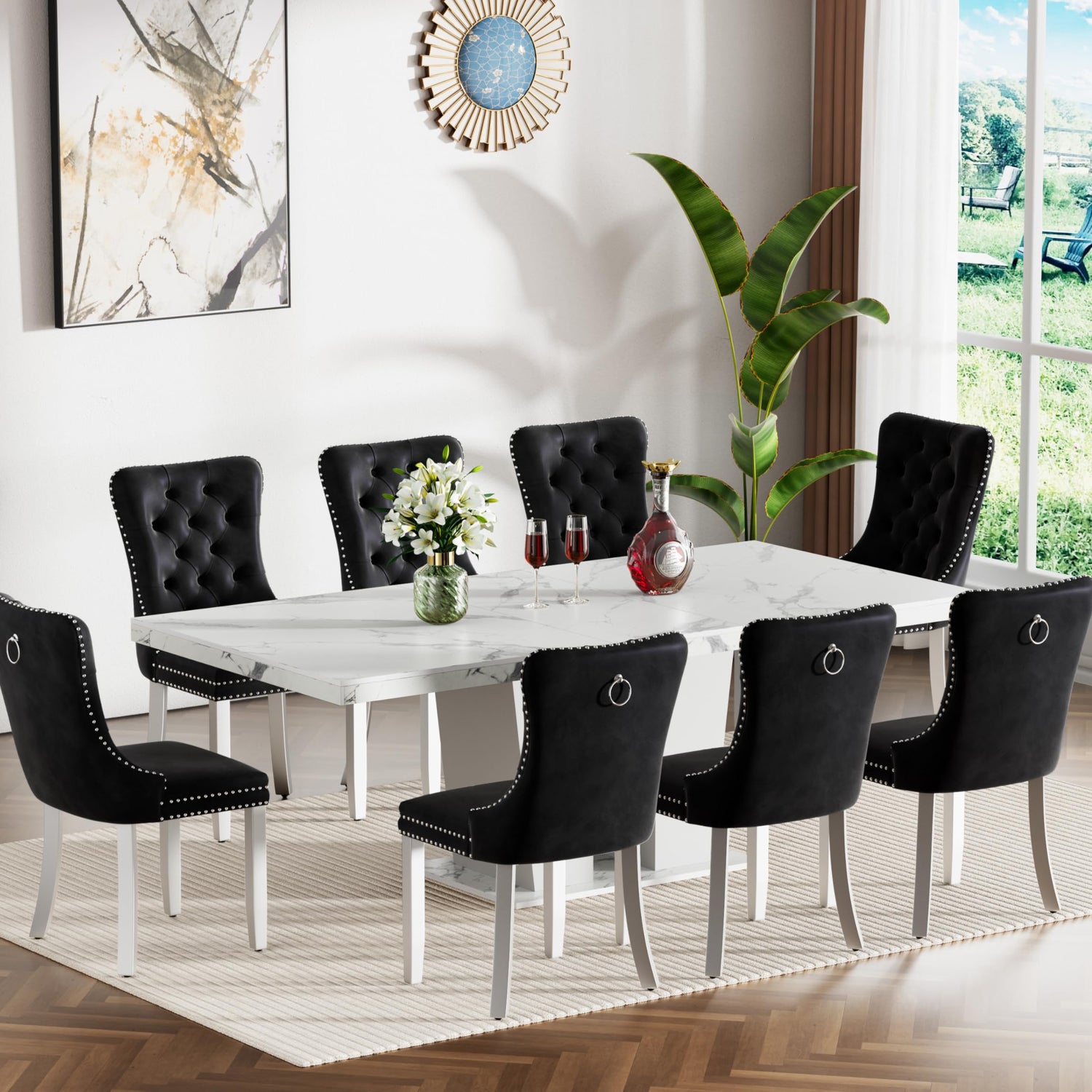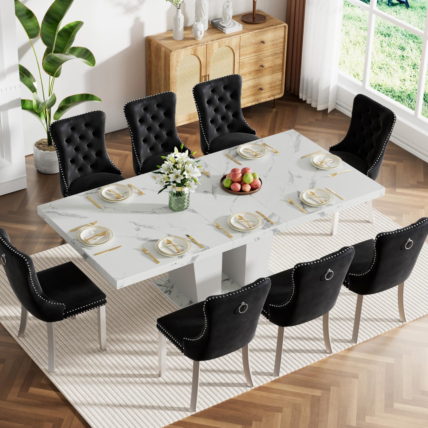 Henf 9 Pieces Extendable Dining Table Set for 8, 63"-79" White Marble Grain Extendable Kitchen Table Set w/8 Black Tufted Chairs,Mid-Century Modern Expandable Wood Dining Room Tables Set for 8