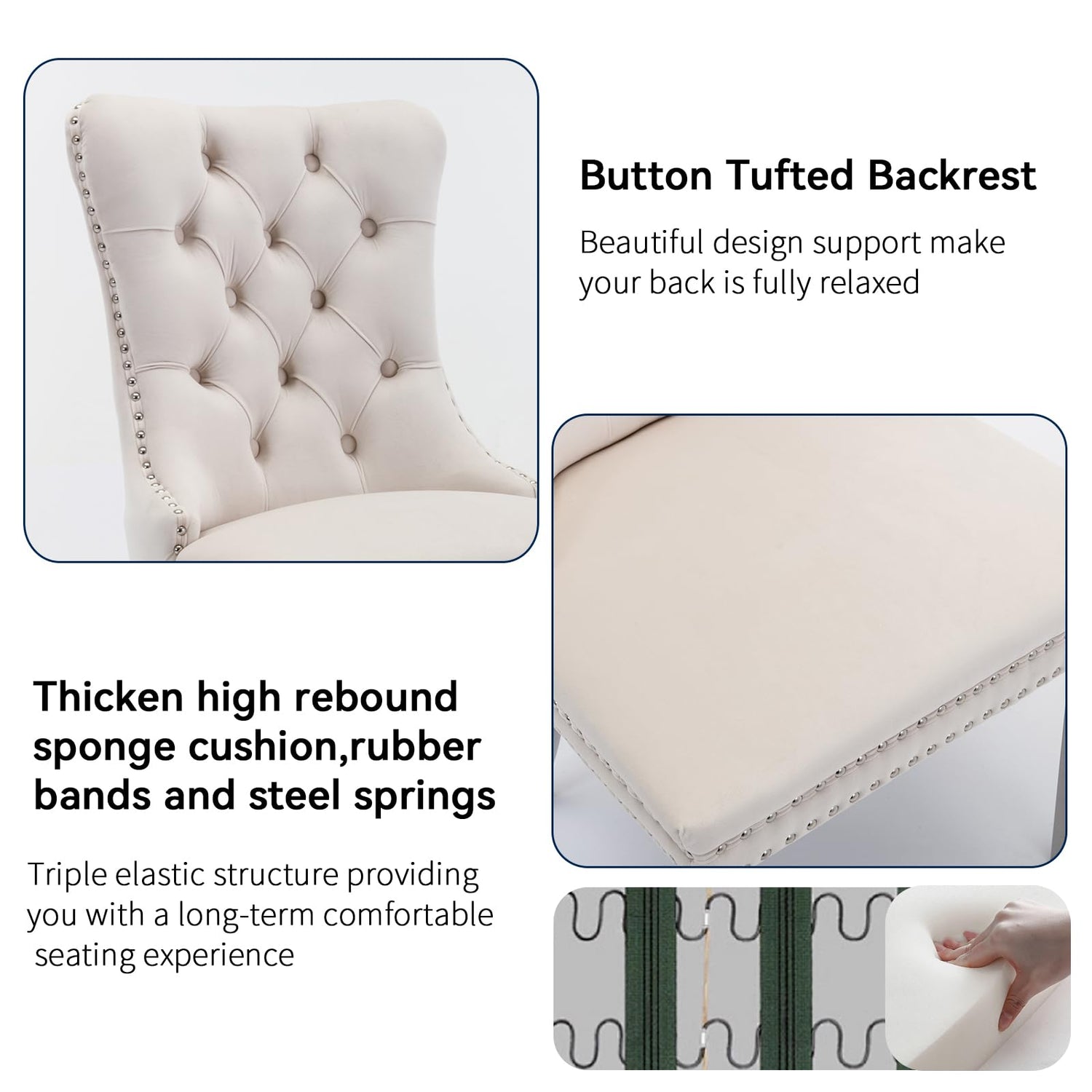 - 【Comfortable Velvet Dining Chairs】The dining chair features high-quality velvet upholstery and dense padding. Handcrafted decorative nailhead trim completes the design with a dash of distinction. The cushion uses a high rebound sponge,rubber bands and steel springs, triple elastic structure providing you with a long-term comfortable seating experience. It provides you or your friends with more comfort while dining