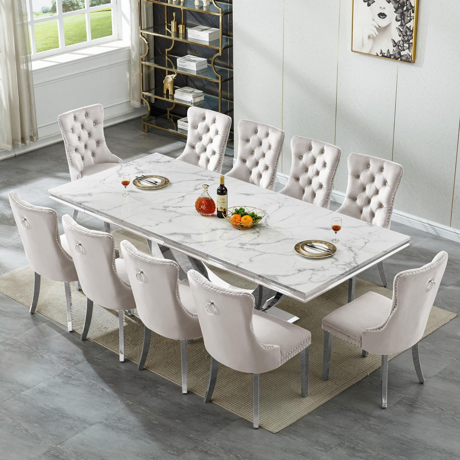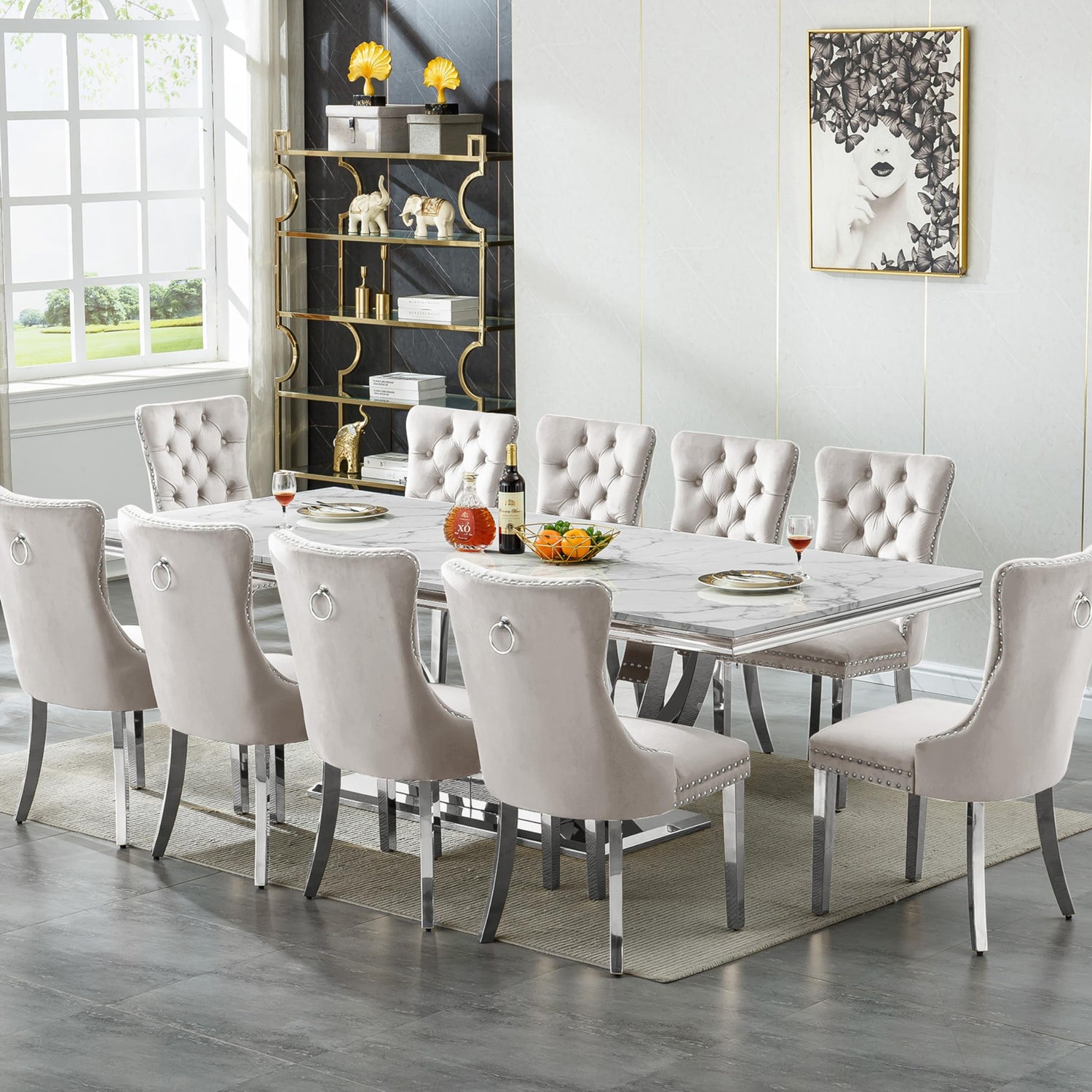 KUVADAZ 94" Modern White Silver Faux Marble Dining Room Table Set for 10, 11-Piece Rectangle Kitchen Dining Room Table Set with Dual U-Shaped Stainless Steel Legs and 10 Beige Velvet Dining Chairs