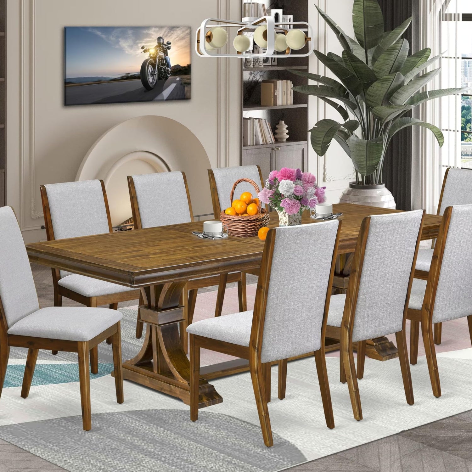We are delighted to introduce our meticulously crafted 9-piece Extendable Kitchen Table Set, which includes a dining table and 8 elegant chairs. This Dining set is crafted to create a warm and inviting atmosphere in your dining area, perfectly tailored to meet your comfort and aesthetic preferences, as well as those of your guests. The kitchen table features a modern design that seamlessly integrates with any decor, highlighted by an Antique Walnut tabletop and sophisticated pedestal legs. The accompanying chairs, upholstered in plush Grey Linen Fabric with a chic Antique Walnut finish, add a touch of refinement to your dining space. Constructed from durable materials, the table and Acacia wood chairs are built for longevity, ensuring lasting quality. The luxurious dining chairs provide comfortable seating, expertly upholstered in high-quality Linen Fabric for maximum comfort and durability. With their high-back style and resilient foam padding, they ensure an enjoyable dining experience, whether dining alone or with guests. Experience dining in both style and comfort with our carefully crafted set, designed to exceed your expectations.