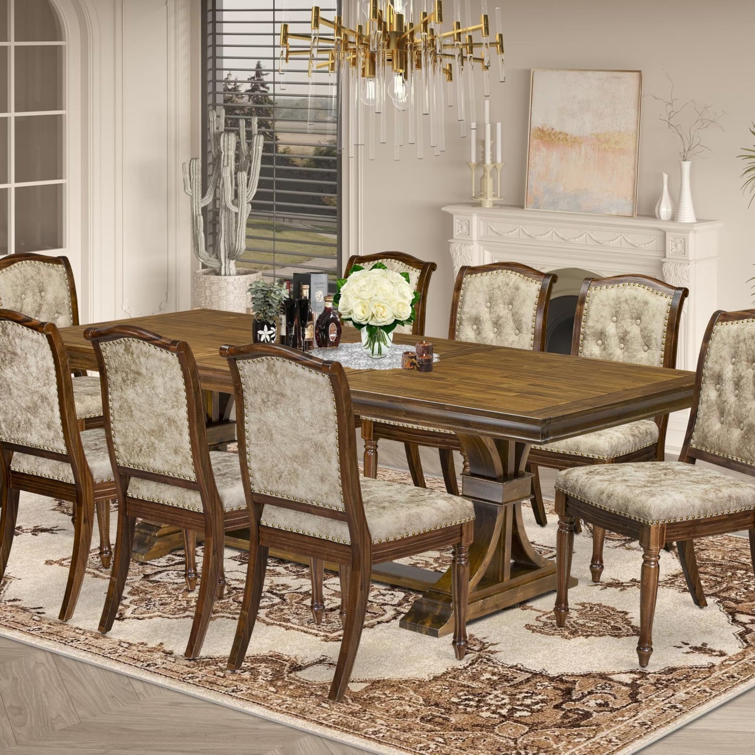 We are pleased to present our meticulously designed 9-piece Extendable Dining Table Set, which includes one dining table and 8 elegant chairs. This distinguished set is crafted to elevate your dining space, seamlessly combining comfort with sophisticated style. The modern dining table features a contemporary design with an Antique Walnut tabletop, supported by elegant pedestal legs. Complementing the table, the dining chairs are upholstered in luxurious Light Beige PU Leather and finished in Antique Walnut, imparting a touch of refinement to your dining area. Constructed from durable Acacia wood, both the table and chairs are engineered for longevity. The high-quality PU Leather upholstery of the chairs ensures exceptional comfort and resilience. Their Button Tufted design, combined with resilient foam padding, offers a superior dining experience, whether entertaining guests or enjoying a quiet meal. This thoughtfully designed set is crafted to meet and exceed your expectations in both style and functionality.