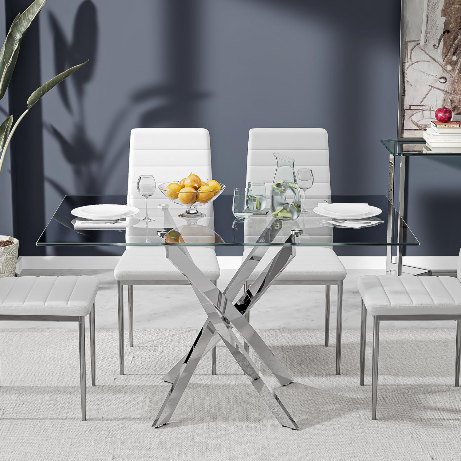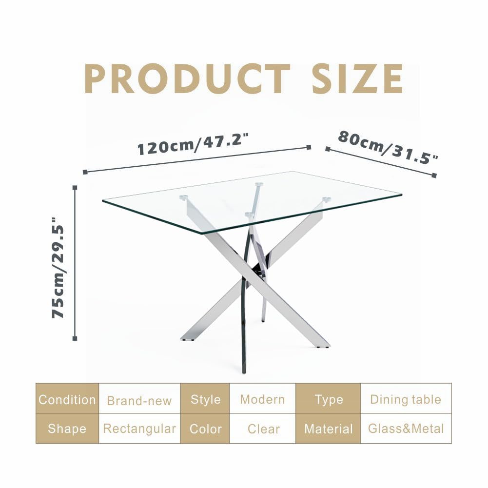 - Strong Material and Proper Size: Our modern glass dining table is made of clear tempered glass and sliver legs, which are sturdy and durable while easy to clean. 4 PVC dining chairs are ergonomically designed to provide you with optimal comfort, with upholstered backs and soft padding for the best using experience. The overall size of the dining table is 120 x 80 x 75 cm and the chairs measure 54 x 42 x 96 cm