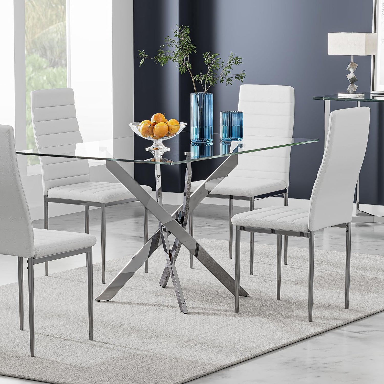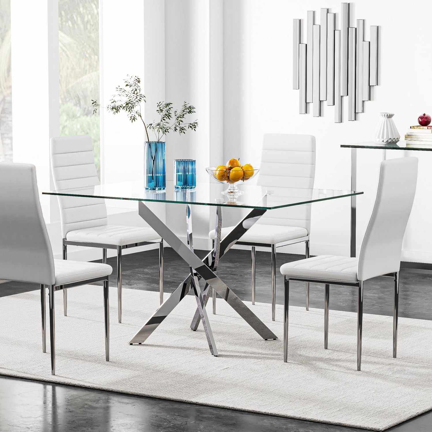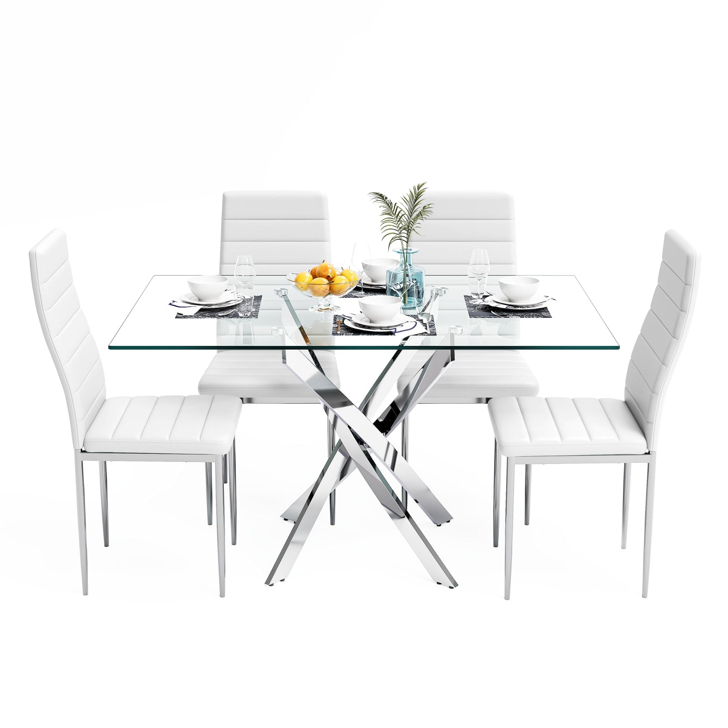 NIERN 5 Piece Dining Table Table Set, Tempered Glass Dining Table Set for 4 Kitchen Table Set with 4 Upholstered Chairs for Kitchen Dining Room (Sliver Table with White Chair)