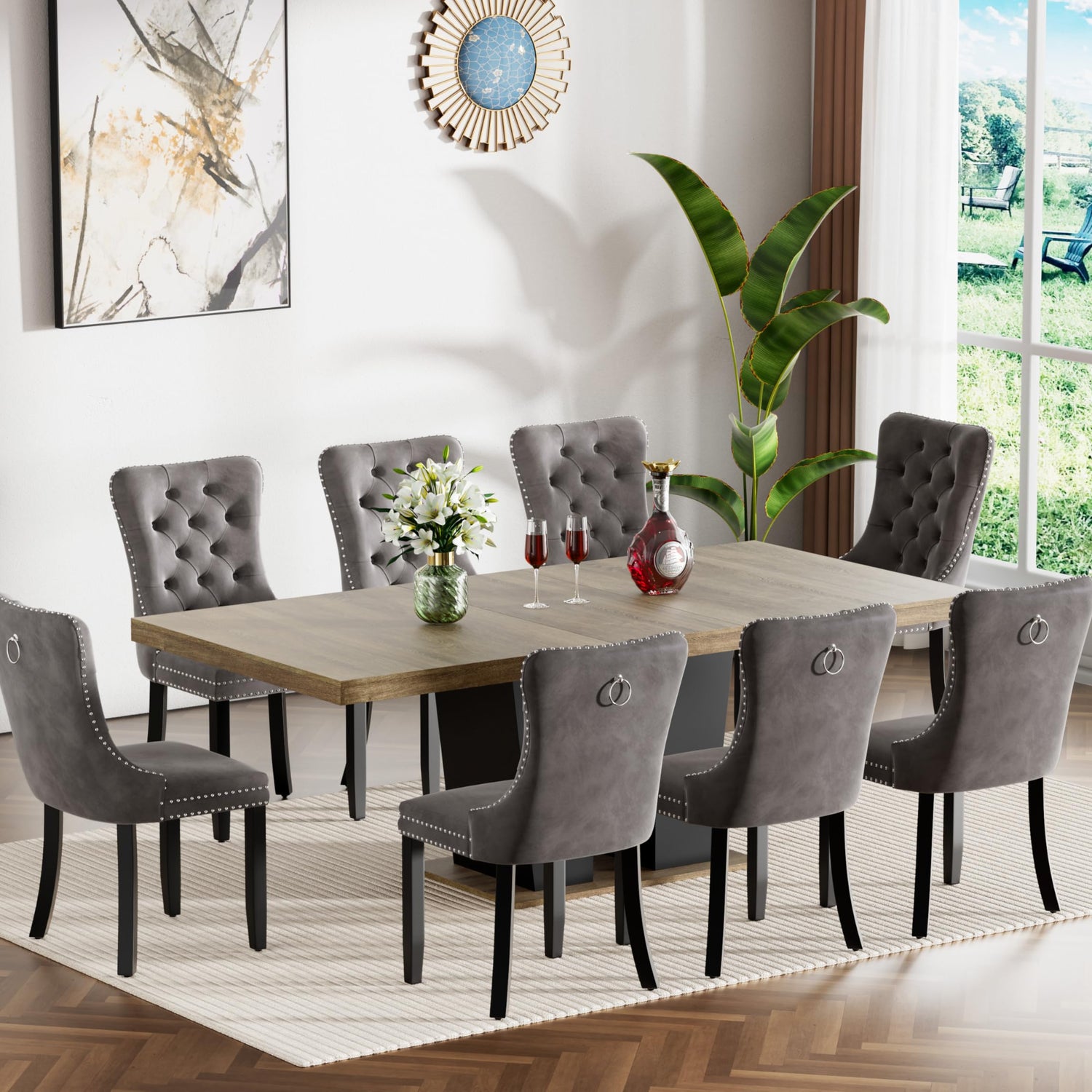 - 62.99"-78.74" Dining Table Set of 8: This kitchen dining table set include 1 dining table, and 8 dining chairs, which makes it perfectly sized for a dinette, kitchen, or any dining area. With a modern design and elegant shape, whether you want to enjoy dinner with your family at the dining table or gather with friends, this dining table set will be a good choice.