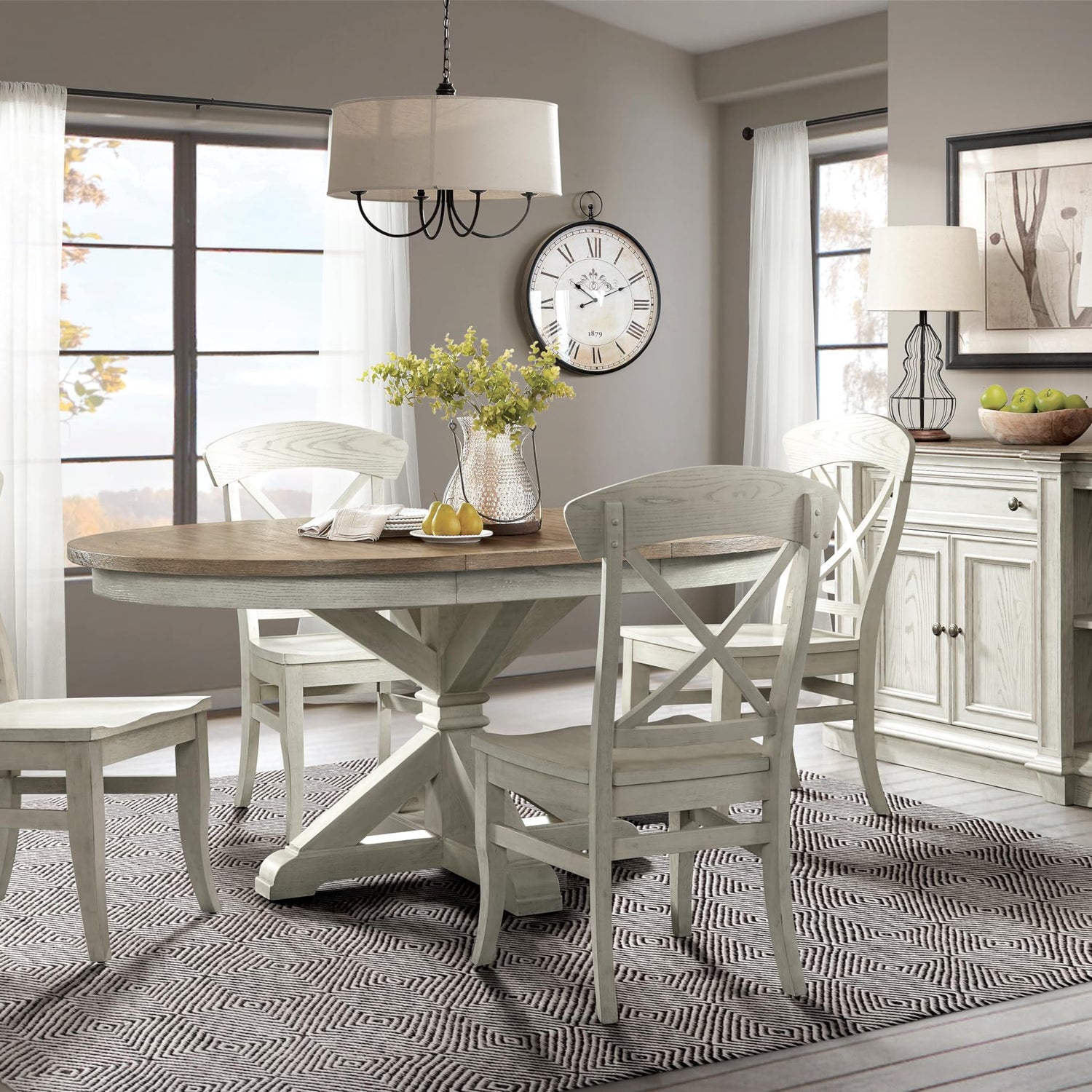 Details: Elevate your dining experience with the Harola Dining Set, a delightful combination of the Harola Round Dining Table and a set of six X-Back Side Chairs. Crafted with meticulous attention to detail, this collection embodies rustic elegance and coastal farmhouse charm. The table's vintage-inspired design complements the cottage style of the chairs. Embrace the warmth of distressed wood finishes and the unique texture of pine solids and veneers. Enjoy the versatility of a round table, which extends to an oval shape with the included 18" leaf, offering space for both everyday meals and special occasions. The Harola Dining Set is an embodiment of timeless beauty and functionality, making your dining room a cozy haven for family and friends.