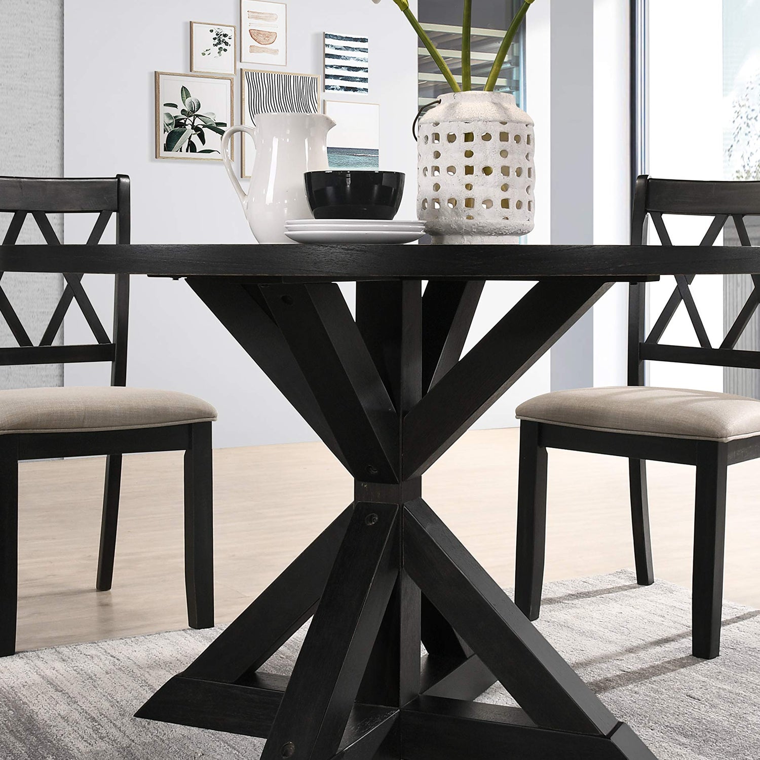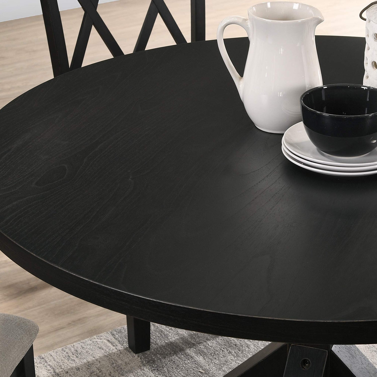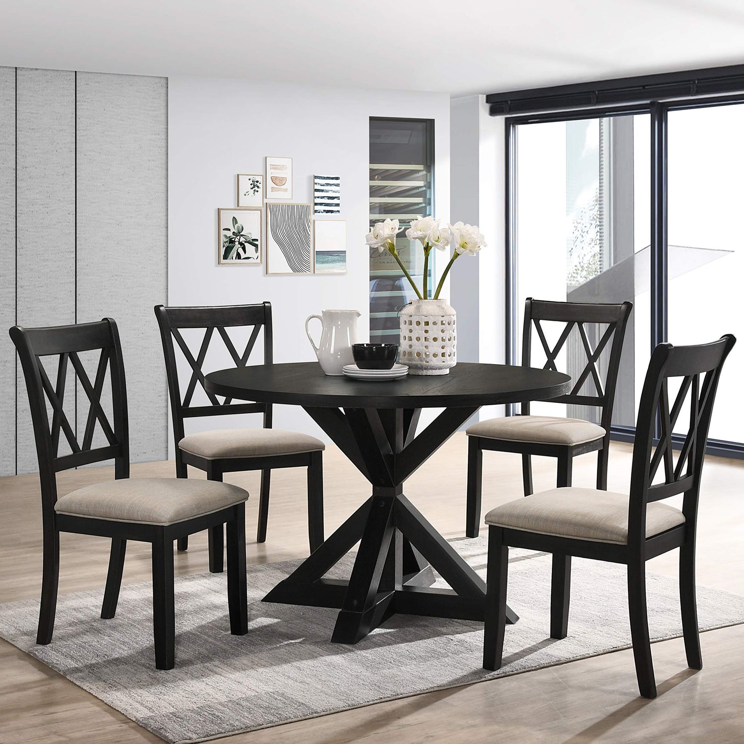 - Dining room set includes round dining table and 4 dining chairs, finished in a rich black. The table features a cross-buck table base