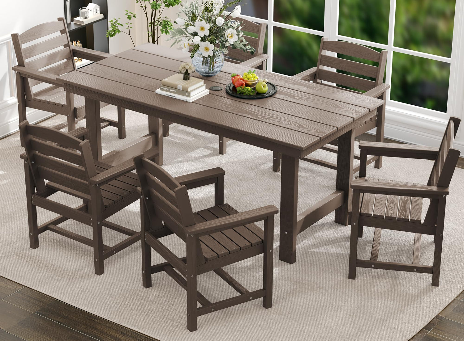 • 【Indoor & Outdoor Use】Different from the normal HDPE dining sets, Our dining table and chairs are designed with wood texture. The classic appearance make this dining table sets more usable for indoor or outdoor.