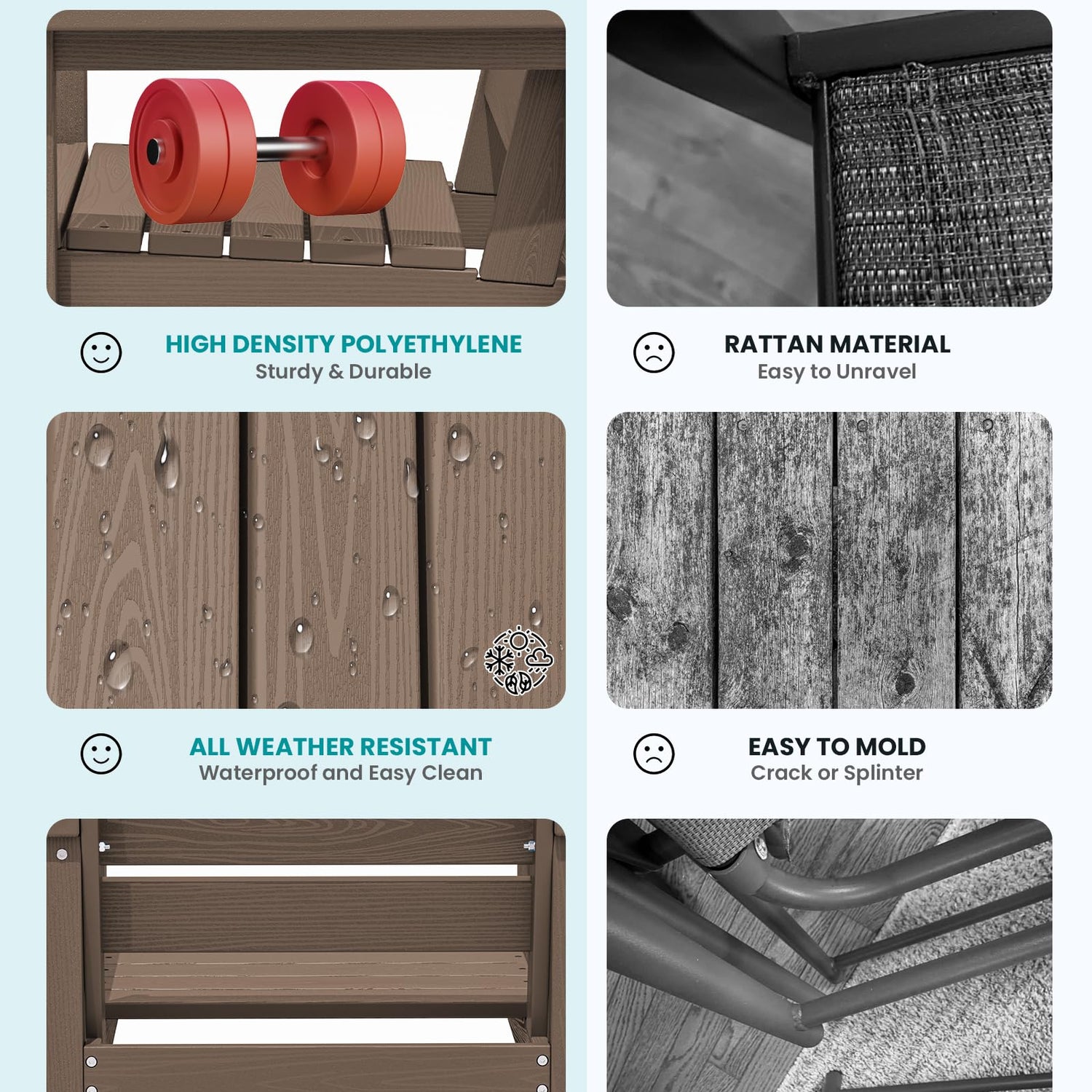 • 【Low Maintenance】HDPE dining table sets required low maintenance. Unlike the Steel dining sets may require rust prevention, SERWALL dining table and chairs are easy to clean with just soap and water, requiring minimal effort to keep them looking fresh.