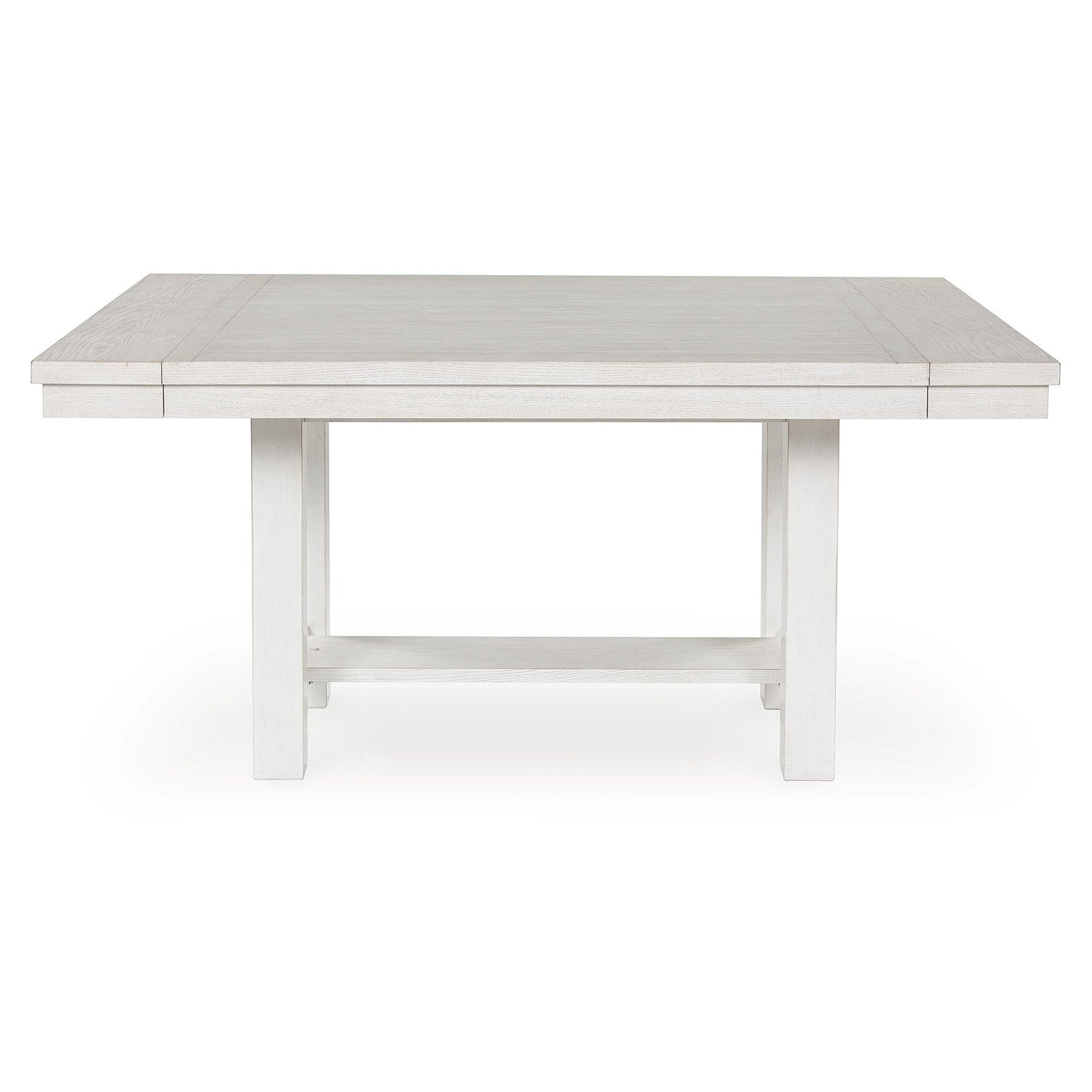 • WELL MADE: Crafted with rubberwood solids, ash veneer & MDF substrates. Antiqued white finish with grain texture. Tabletop with planked effect. Table extends by pulling both ends & dropping in leaves