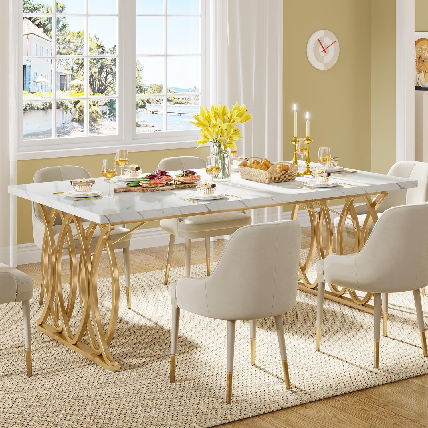 • Modern Dining Table: The dining table features a sublime white faux marble top that radiates sophistication. The magic of the captivating gold steel frame adds a significant layer of glamour and enduring elegance to your home. This cohesive fusion of contemporary design with a touch of luxury invokes a higher echelon of lifestyle quality.