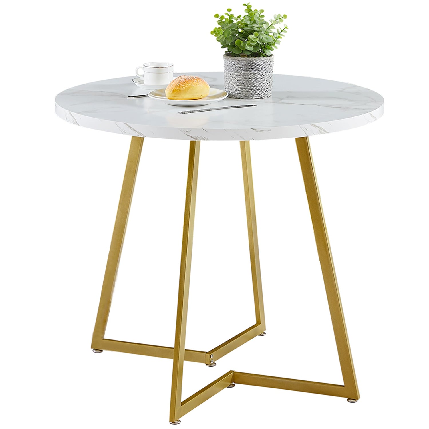 VECELO Round Dining Room Table with Wood Grain Tabletop and Steel Frame, for Kitchen, Living Room, Office, Conference, 2 to 4 Person, White & Gold