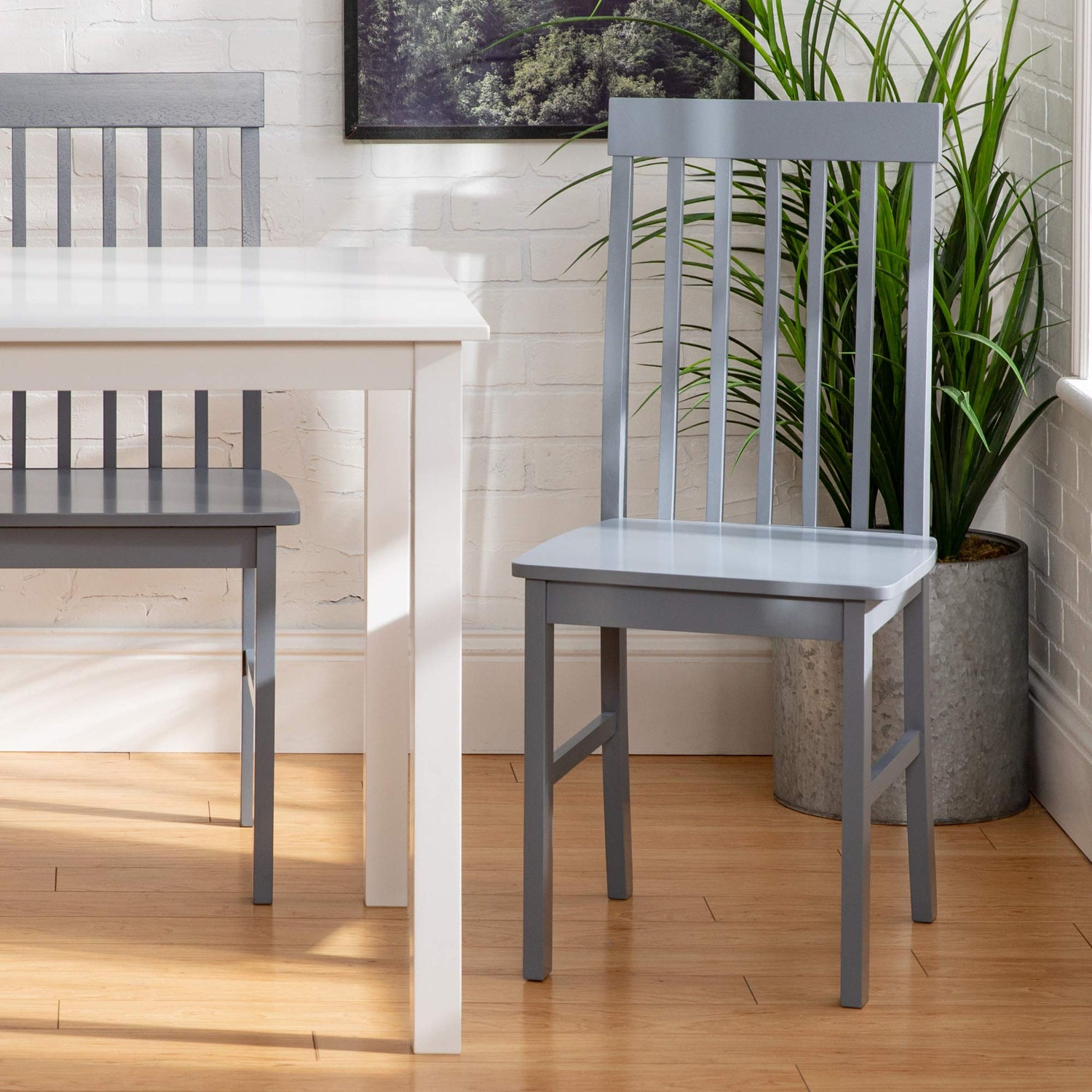 Details: Take your kitchen or dining area to the next level with our modern style dining set. Including four slatted back chairs with slightly curved angles throughout, in a colored finish. The table features a classic, straight-line design with a painted, fresh white finish for a simple, yet elegant table. Enjoy meals with your family, with this stylish dining set. Ships ready-to-assemble with step-by-step instructions.