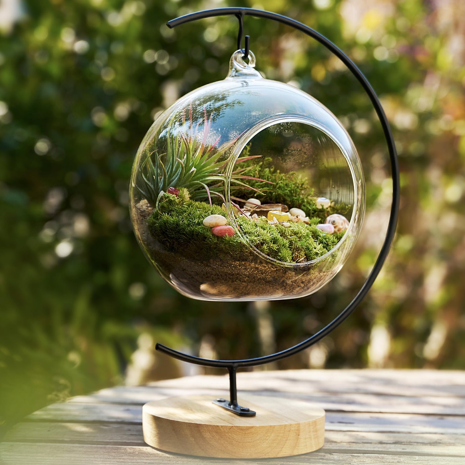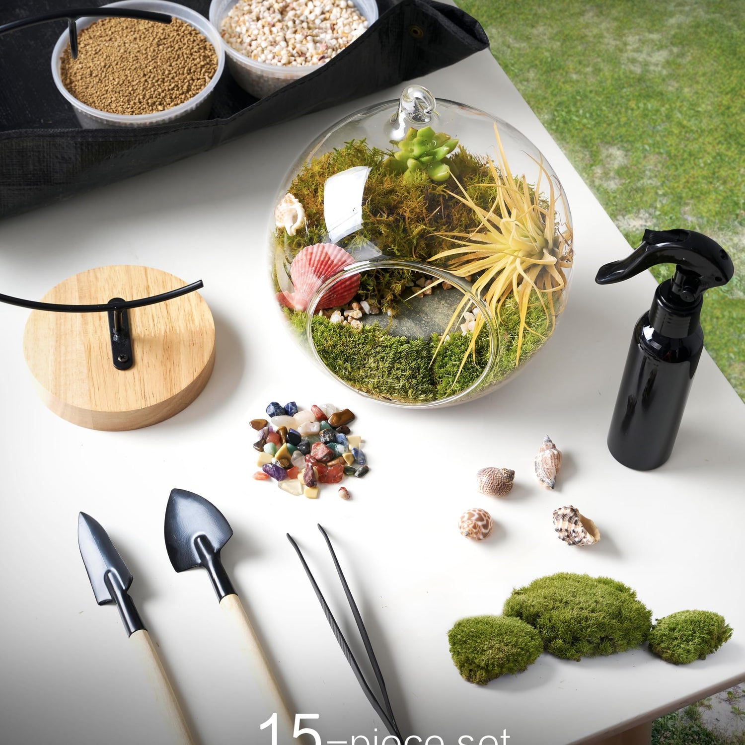 - 15-Piece Terrarium Kit with Live Moss and Tools Includes all components needed to build a miniature moss terrarium: live moss, glass globe, spray bottle, tweezers, shovel, crystal stones, sea shells, nutrient soil, and printed care instructions. Ideal for indoor décor or gifting.