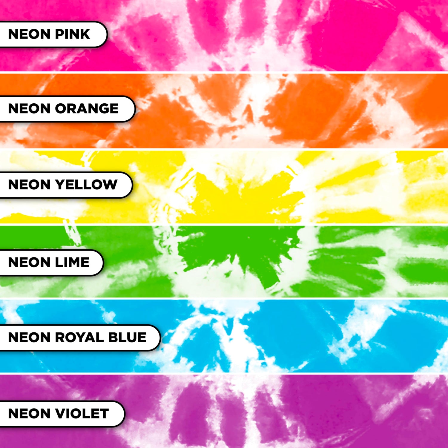 Details: The Tulip Neon Tie-Dye Kit includes 6 (2 fl. oz.) black light reactive dyes in a bright neon palette (Neon Pink, Neon Orange, Neon Yellow, Neon Lime, Neon Royal Blue, Neon Violet) plus 4 gloves, 20 rubber bands, and project guide. Add shocking neon colors to your wardrobe with these ready-to-use dyes— no mixing required, just shake and apply! All Tulip One-Step Dyes are nontoxic and safe for crafters of any age or experience level. Works on both synthetic and natural fiber fabrics. Dyes are safe to machine wash – colors stay bold through repeated washings.