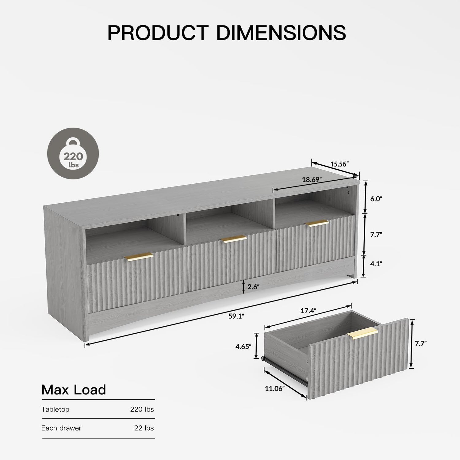 Amada TV Stand for 50-65" TV, Fluted Modern TV Stand Entertainment Center with Drawers and Open Shelf, Waveform Panel, Sleek Curved Profile Media TV Console Table for Living Room, Bedroom, Grey