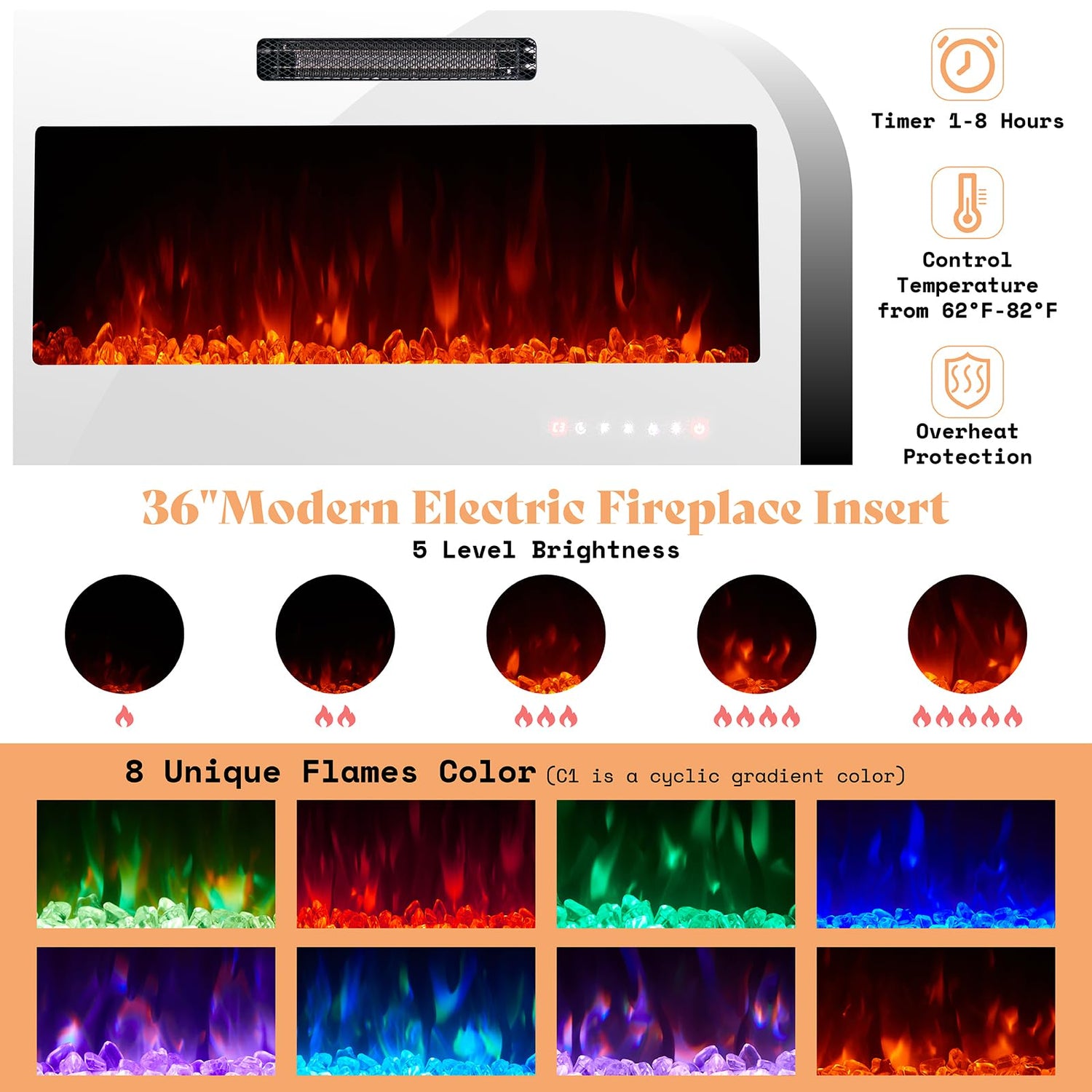 - 36in Electric Fireplace-8 changeable realistic flame colors & 5 levels brightness, temperature control, and timer setting with remote controlled, set the temperature and time as you wish, warm your life