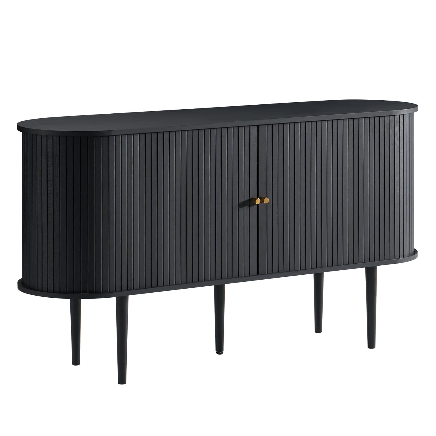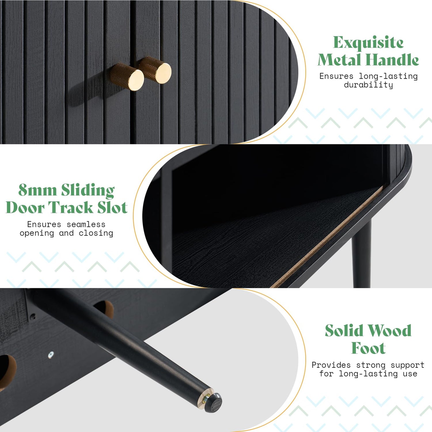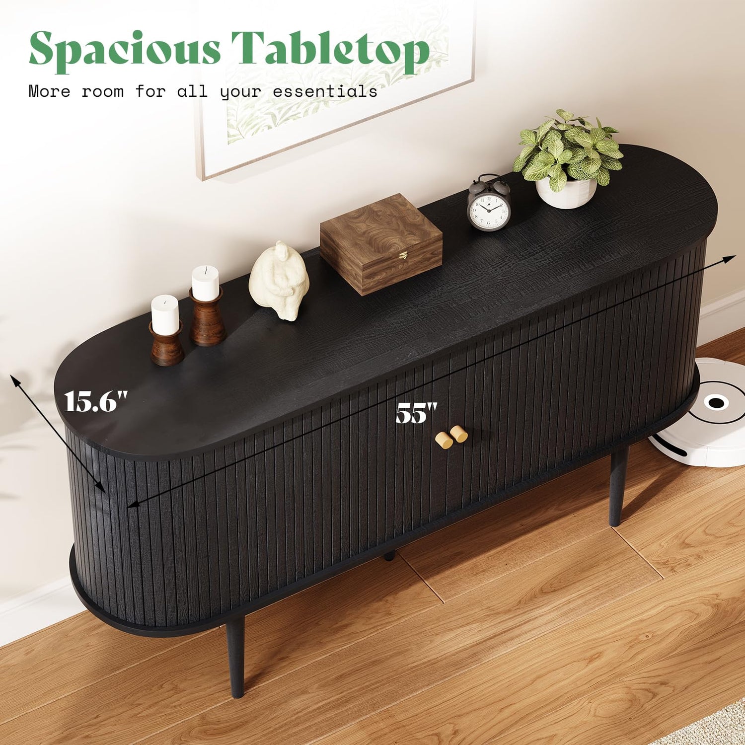 AMERLIFE 55" TV Stand with Solid Wood Legs, Mid Century Modern TV Console with Tambour Door for 80-inch TV, Dust-Proof Storage Cabinet for Living Room, Embossed Black