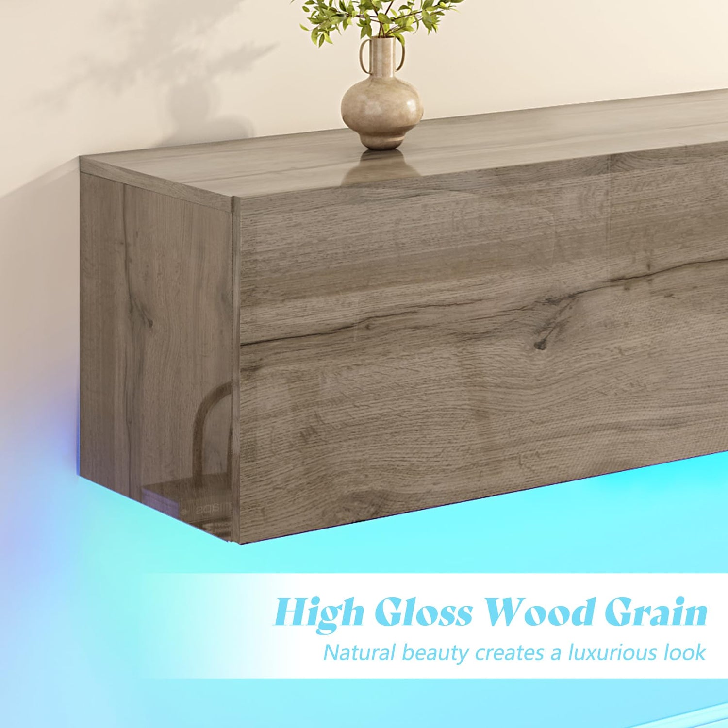 AMERLIFE 70" Floating TV Stand with LED Lights and Power Outlet, High Gloss Wooden Texture Wall Mounted Media Console Entertainment Center for TVs Up to 80", Grey