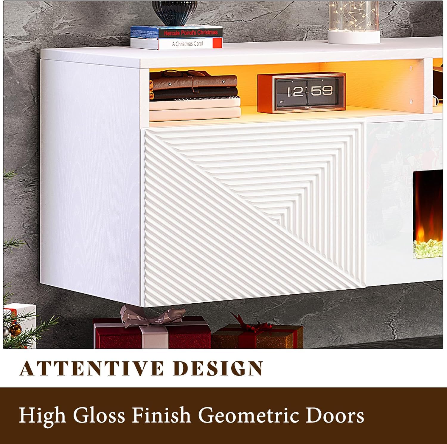 - RGB LED lights: LED light on top panel of this floating TV console has over 6,000 colors to match your mood, with lights that sync to the music. Built-in LEDs only match the fireplace color, creating a unified and inviting ambiance