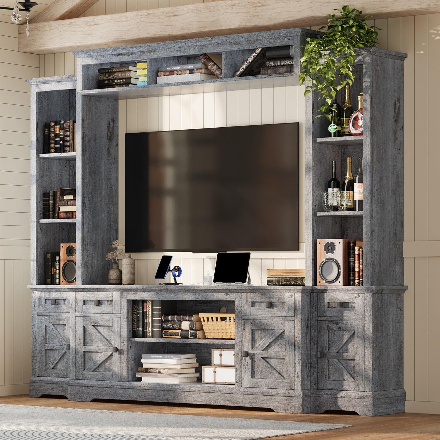 - [Massive Storage Capacity] Wall unit entertainment center side has open space with adjustable and fixed shelves, perfect for books, DVDs, wine bottles, or decor. Barn door storage cabinets with drawers hide clutter while maintaining a sleek look.