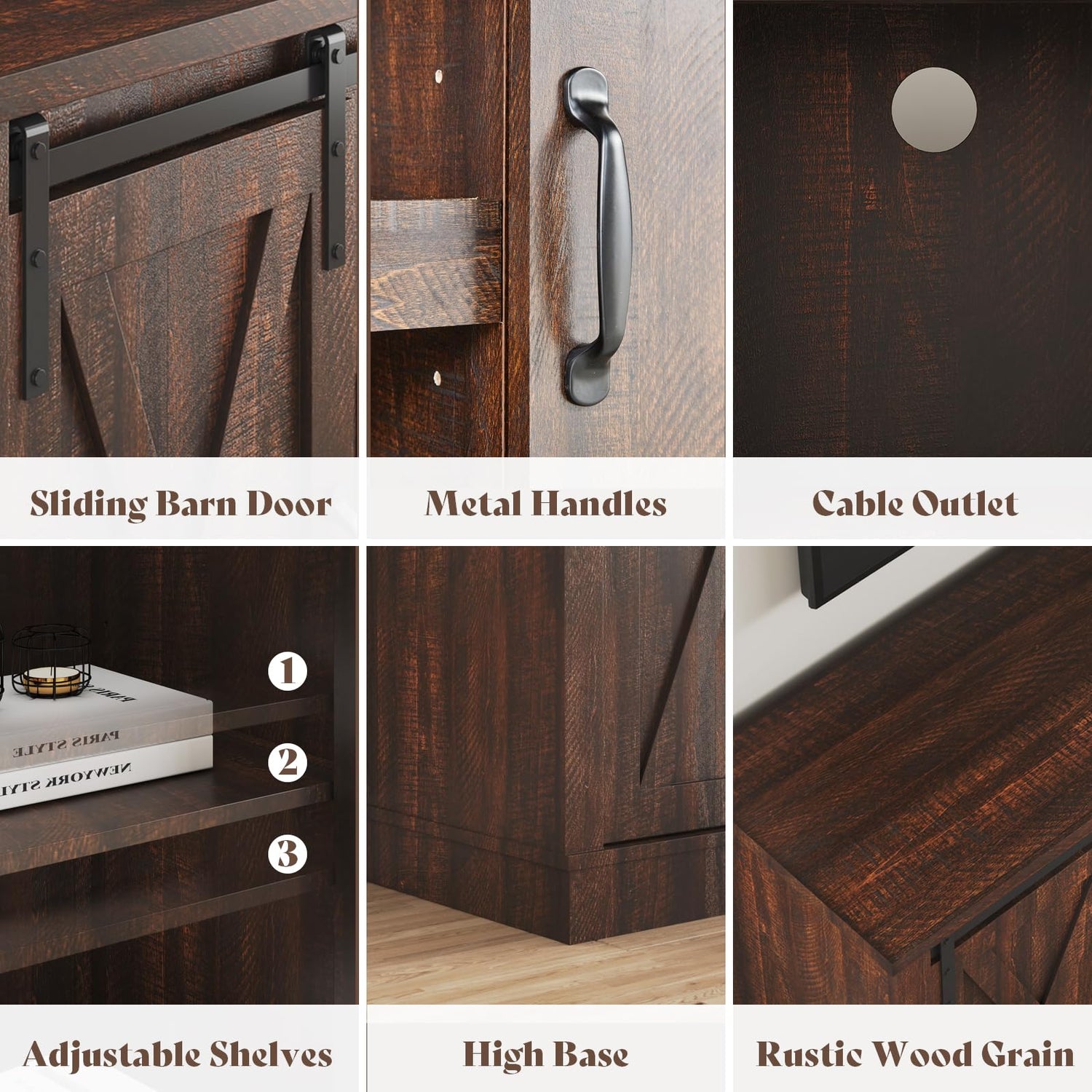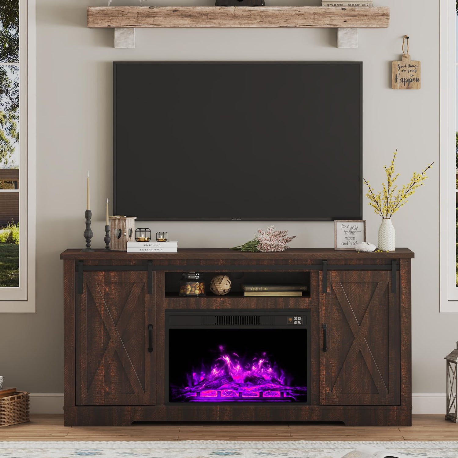 AMERLIFE Fireplace TV Stand with Sliding Barn Door for TVs up to 73", Farmhouse 63" Fireplace Entertainment Center with Storage Cabinets/Adjustable Shelves, Reclaimed Barnwood