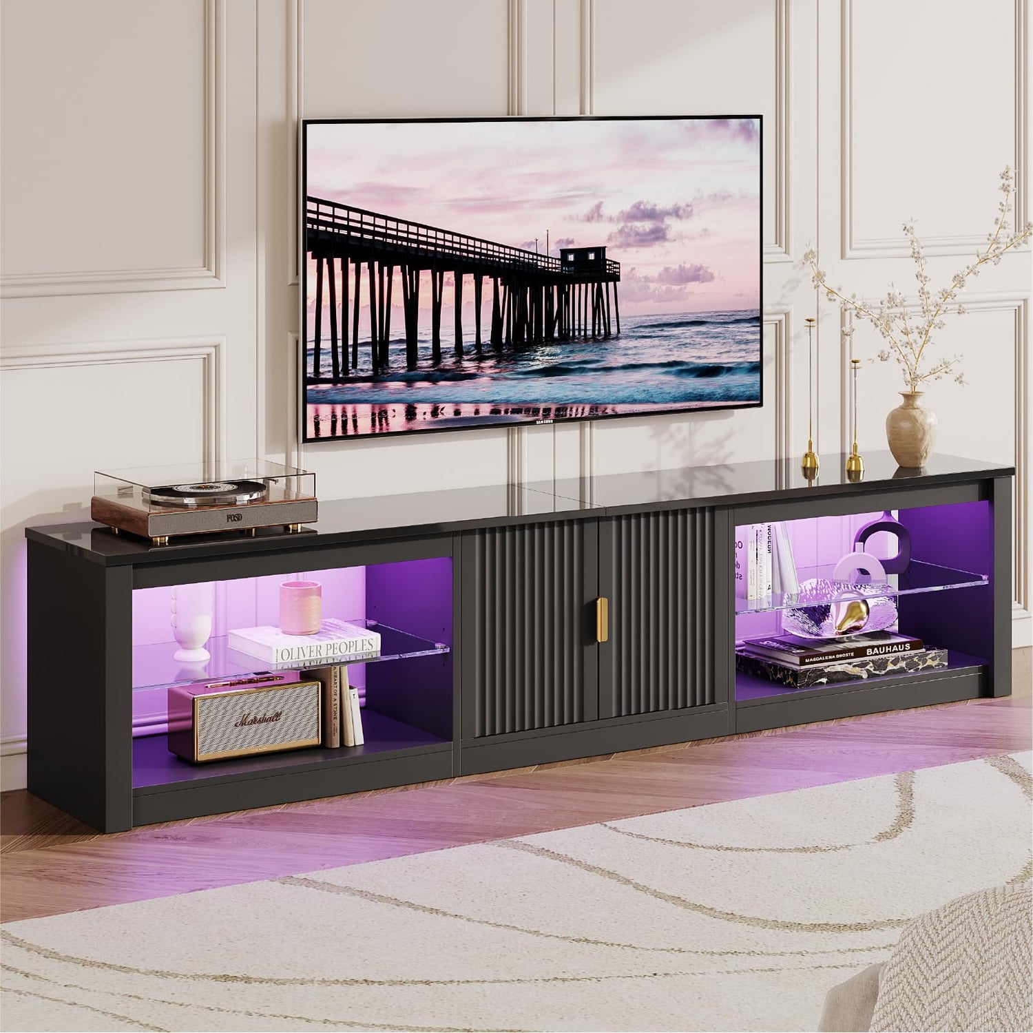 Bestier 80 Inch TV Stand for 75/85/90 inch TVs, LED Gaming Entertainment Center with Storage Cabinet & Adjustable Shelves, Modern High Gloss TV Console Table for Living Room Bedroom, Black Glossy