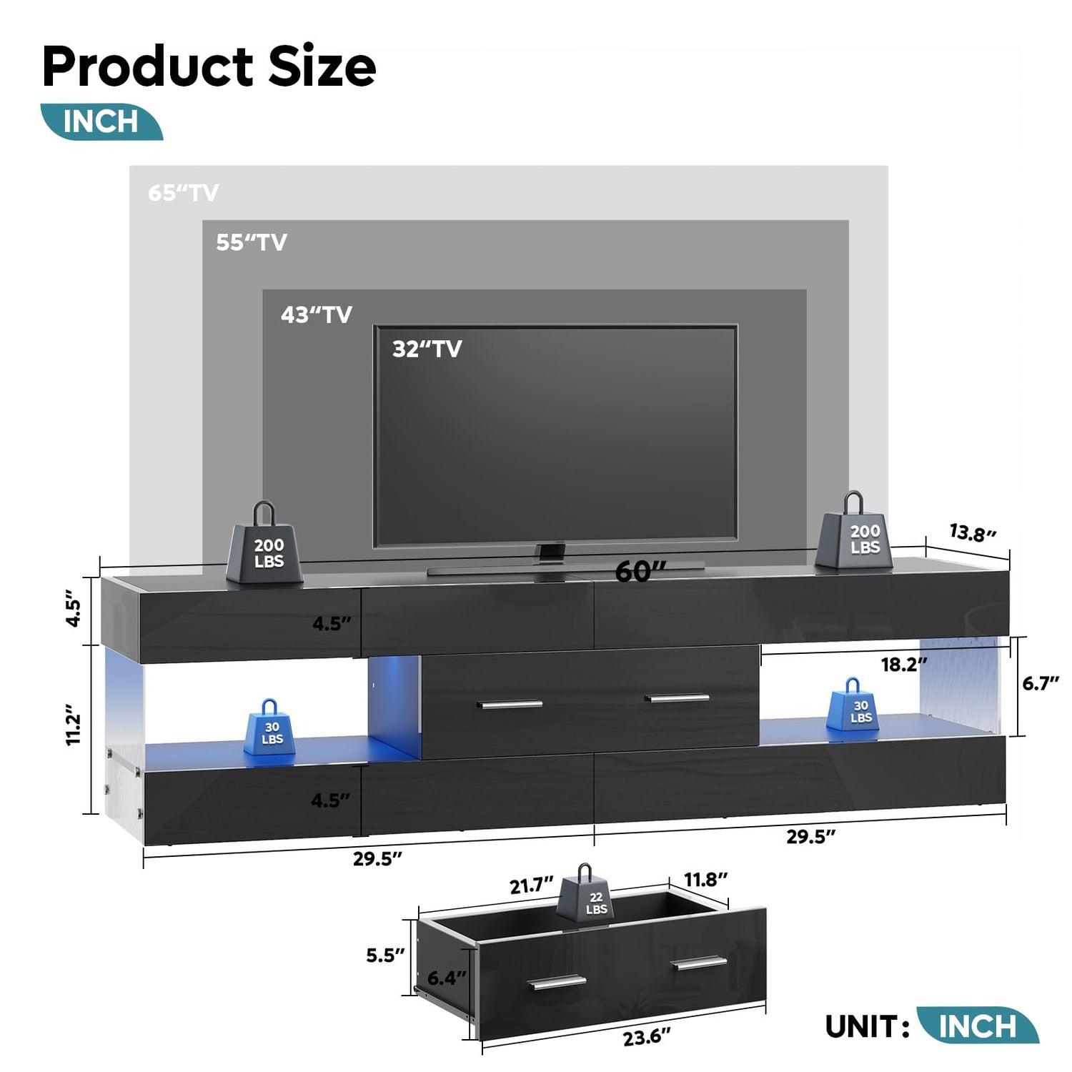 - TV Stand with LED Lights: The integrated LED strip offers 7 colors and 22 dynamic modes to brighten up your entertainment space. Depending on your mood or décor, use the included remote control to select different lighting colors to add a dynamic and modern look to your entertainment area