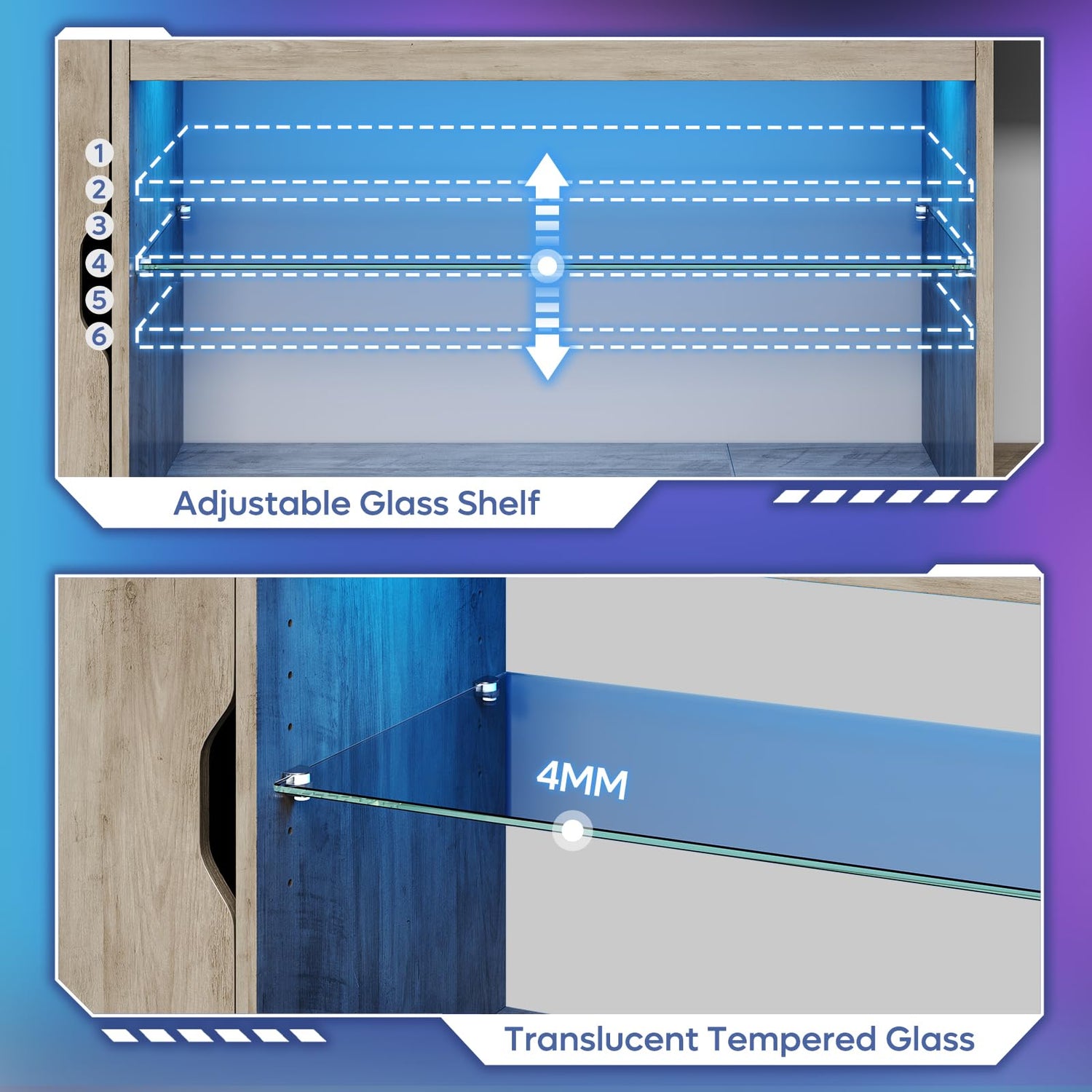 - 【Adjustable Tempered Glass Shelves】The black TV stand features adjustable tempered glass shelves that can be set to 5 different heights. These shelves offer a sturdy platform for your items. When illuminated by LED lights, your TV cabinet create an eye-catching display, show your treasured items beautifully.
