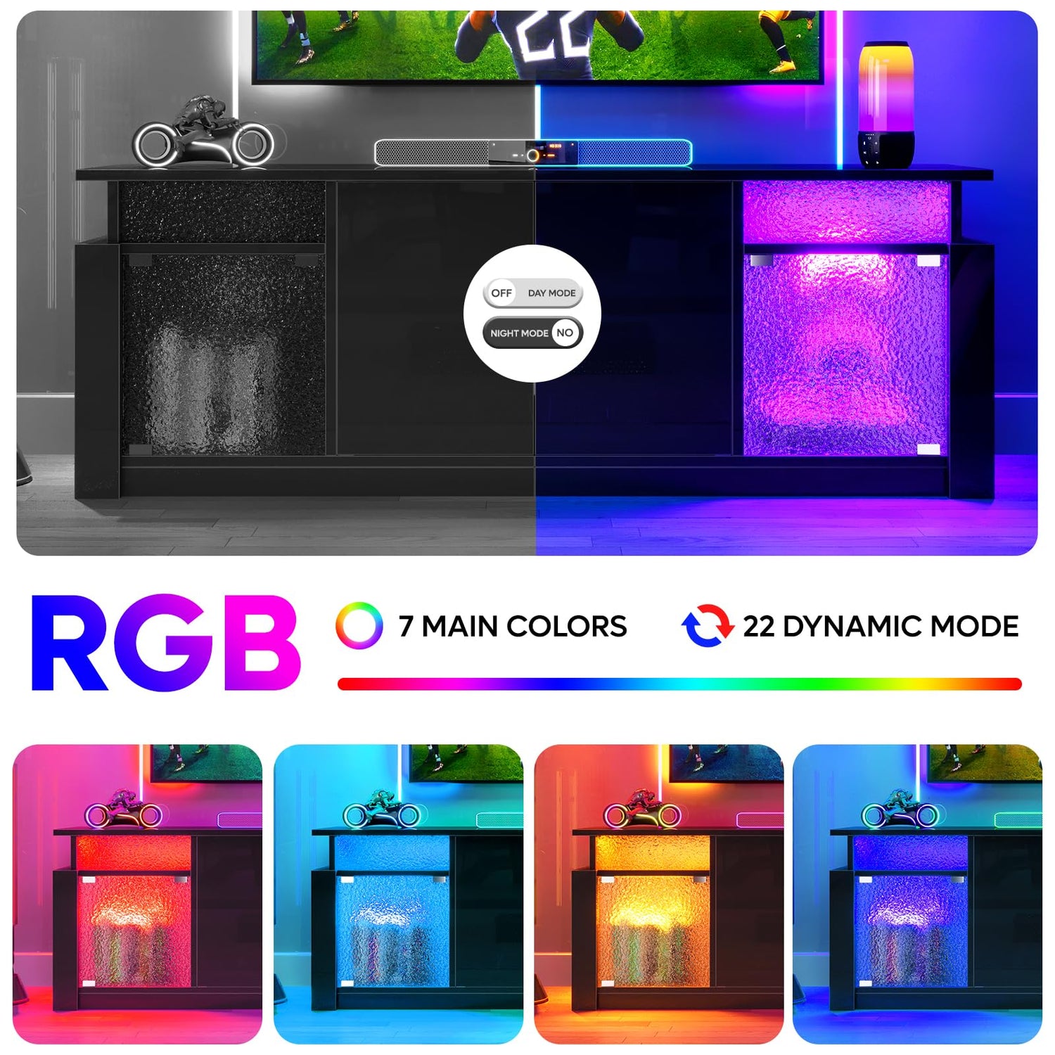 - Dynamic LED Lights: This TV console features RGB LED lights with 7 main colors and 22 modes. Use the included remote control to select different lighting colors to add a dynamic. Whether you’re hosting a party or enjoying a quiet night in, you can customize your space to fit the vibe.