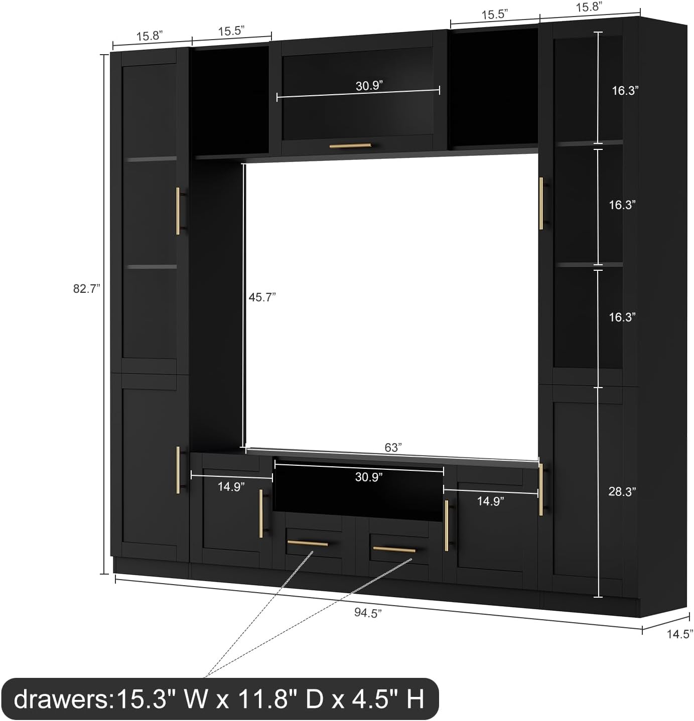 • 【All in One】 The 94 inch entertainment wall unit maximizes storage space and easily meets your various storage needs. It integrates a TV stand, bookshelf, wine rack, and display rack into one, providing a comprehensive storage solution. Overall size: 94.5" W x 14.5" D x 82.7"H.