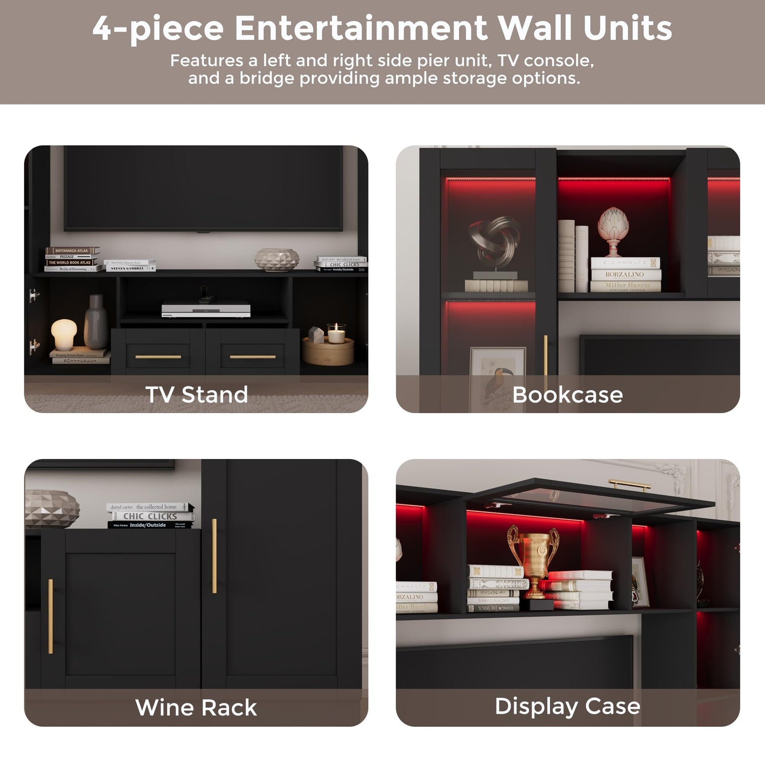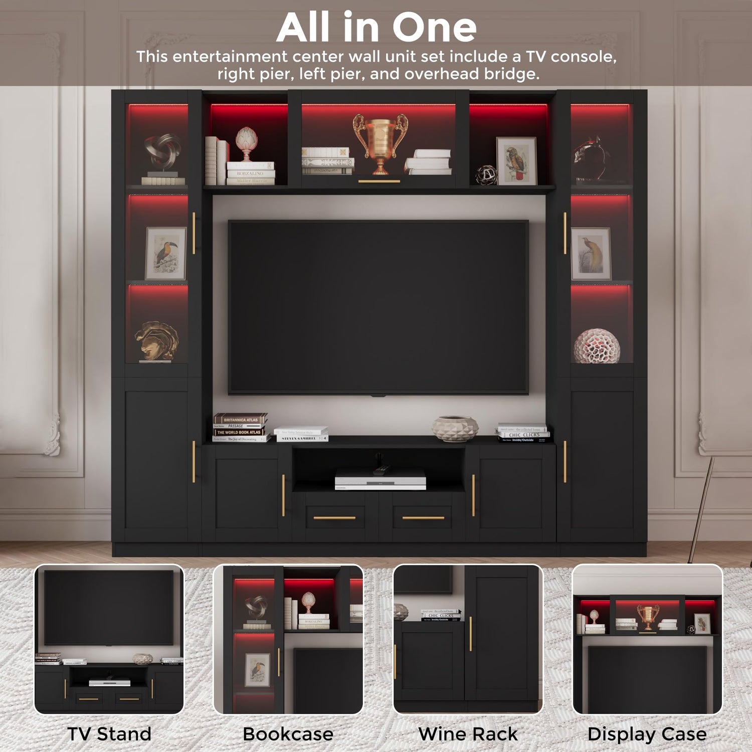 • 【Ample Storage Space】 The entertainment wall unit set includes a TV console, right pier, left pier, and overhead bridge. It features multi-tiers open spaces and closed spaces, available for your needs for displaying and hiding items, help you achieve partition storage. Provides ample storage space for your electronic devices, CD collections, video games, books, collectibles.