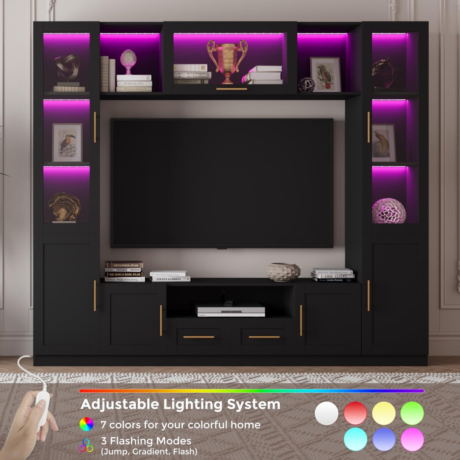 • 【LED Lights】 Our wall unit entertainment center is equipped with eye-catching LED lights. The bookshelves on both sides and the display rack above are equipped with LED lights in 7 different lighting colors. You can use the remote control to freely adjust the light color according to your mood, improving the atmosphere of the living room and enjoying a wonderful night with your family.