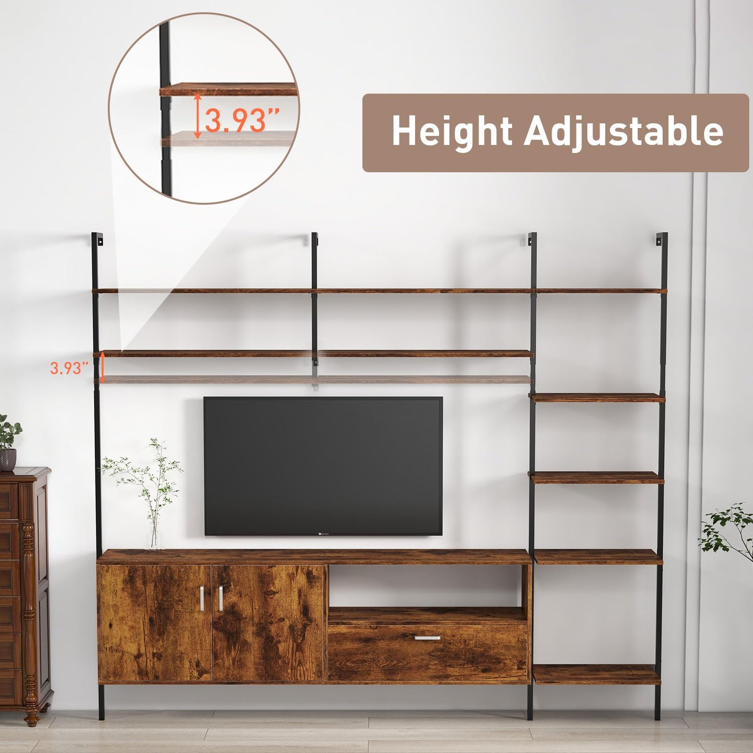 Bonzy Home Wall Mounted TV Stand for TVs up to 60", Industrial Entertainment Center with Bookshelves and Adjustable Shelves, 65" Wall Entertainment Center for Living Room, Rustic Brown