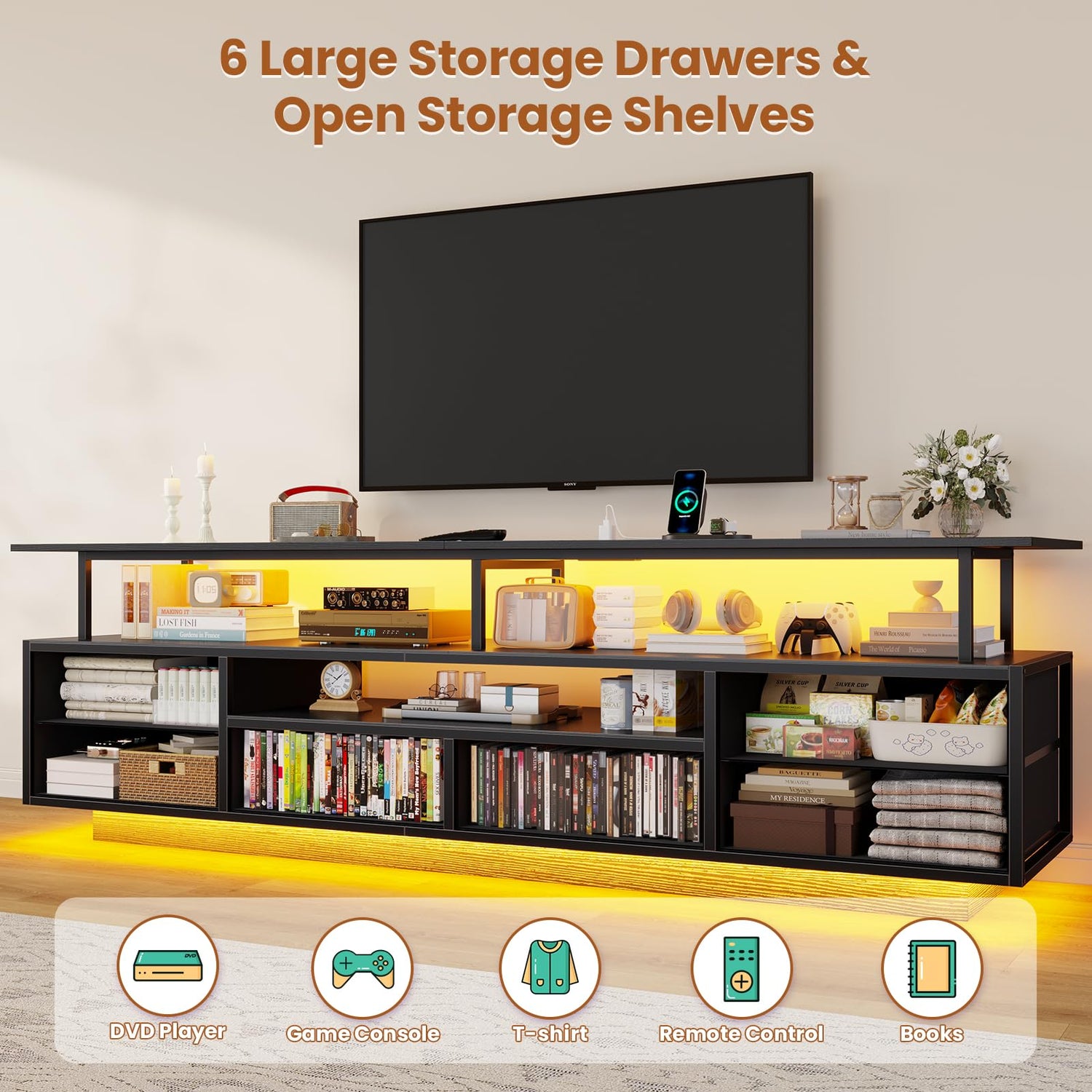 BTHFST TV Stand for 65 70 Inches TV with LED Lights & Power Outlets, Entertainment Center with Open Shelves & 6 PU Fabric Drawers, TV Media Console Table for Living Room, Bedroom, Black