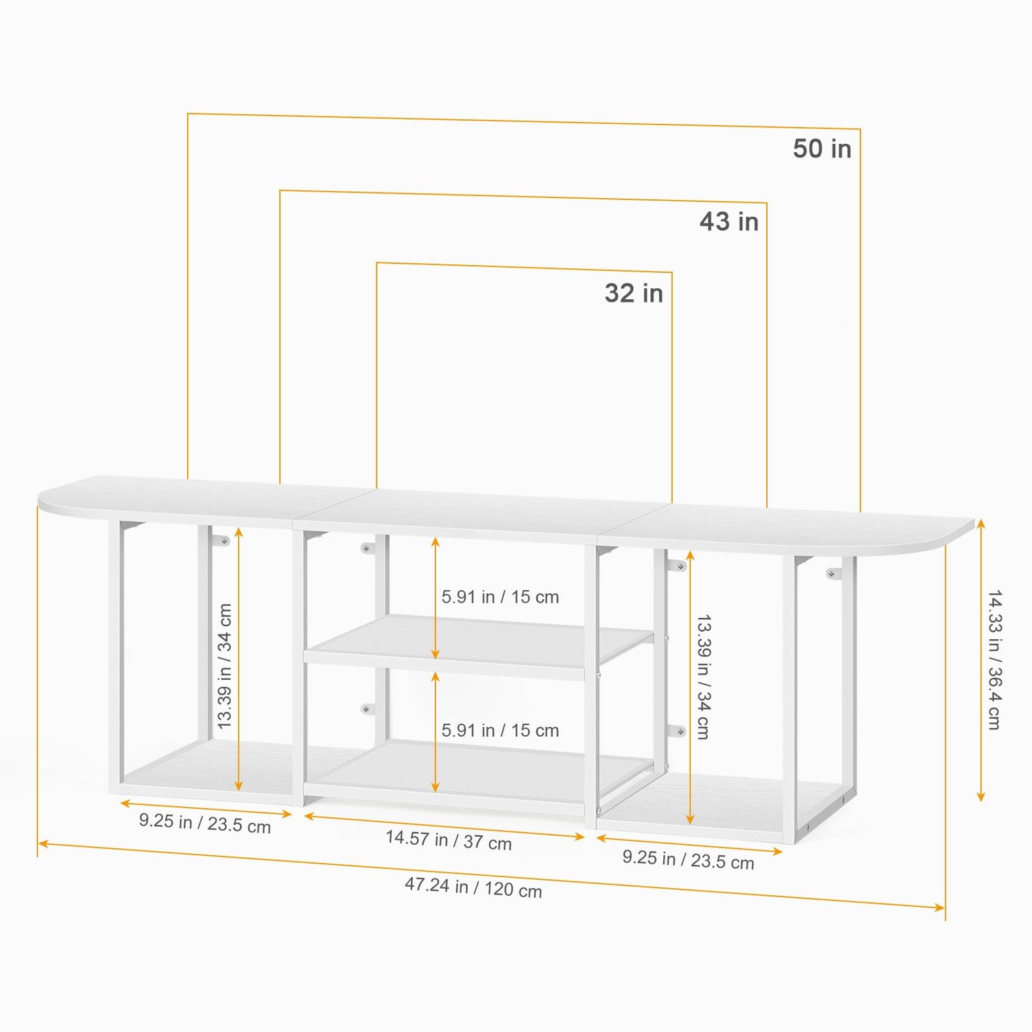 • 【Under TV Shelf】BTY floating TV shelf size: 47.24''W x 11.81''L x 14.33''H, fits most 32-55” TVs. This farmhouse TV stand is designed with easy-to-clean MDF panels and powder-coated steel frames, featuring reinforced expansion screws and metal positioning buckles to ensure the stability and safety of the structure