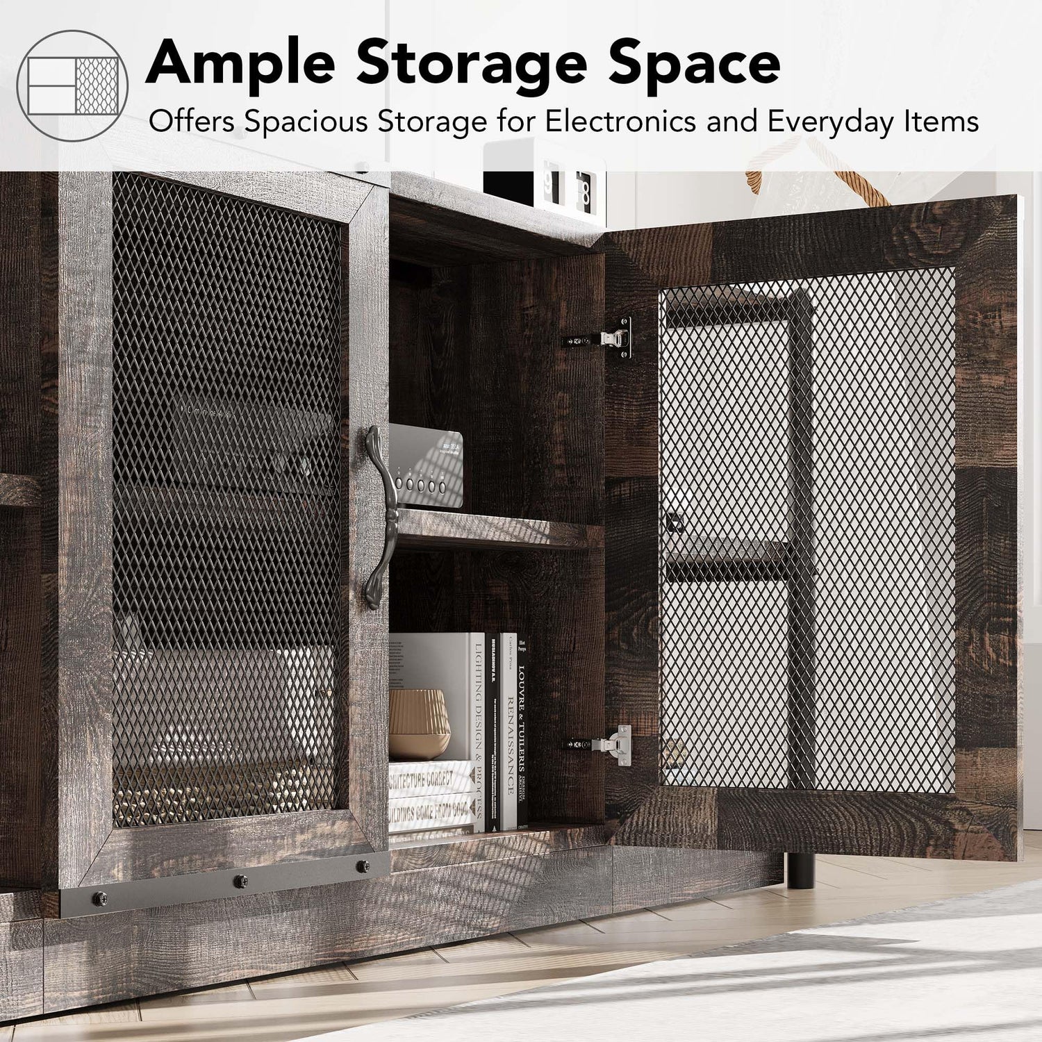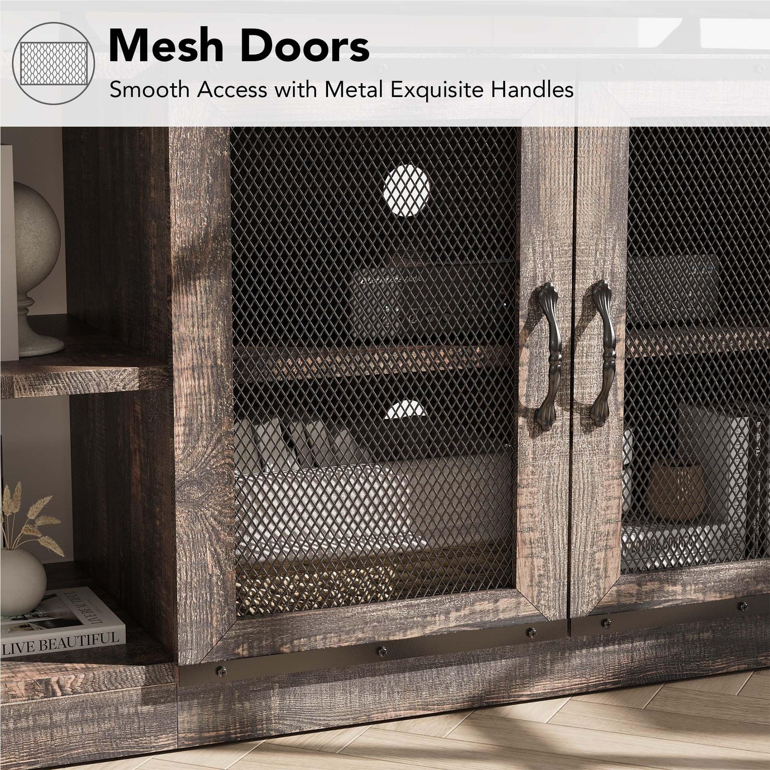 - Industrial Farmhouse TV stand: Blend the timeless appeal of traditional farmhouse style with rustic charm. Featuring classic adopts a visual mesh door designed to allow you to hide or reveal this home entertainment center freely