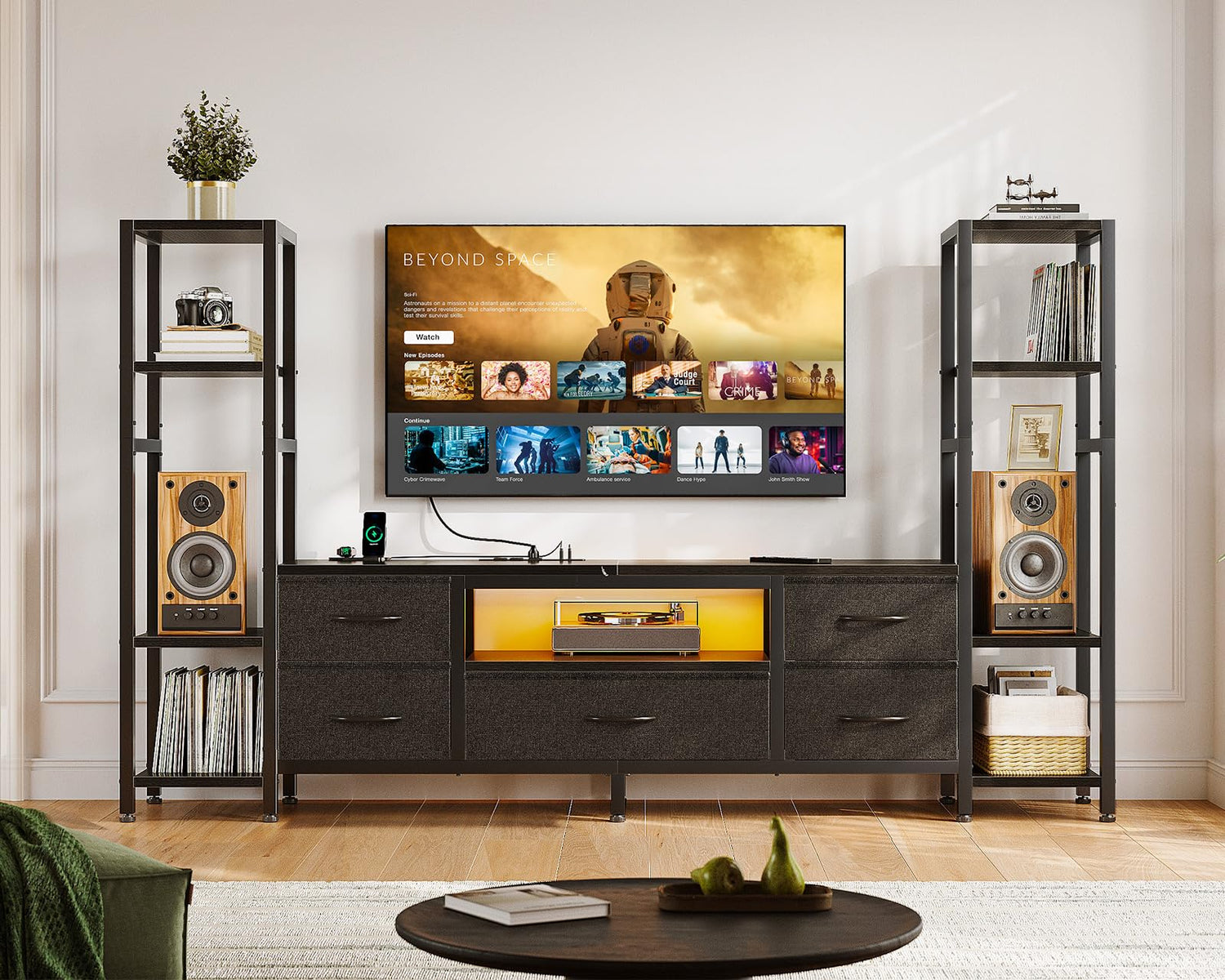 - Spacious 5-Drawer Storage: This tv cabinet features 5 removable fabric drawers, offering ample hidden storage for daily essentials—from clothes and blankets to books, DVDs, and gaming accessories. Paired with open side shelves, it seamlessly blends concealed organization with display space, enhancing both functionality and aesthetics to refresh your living area instantly