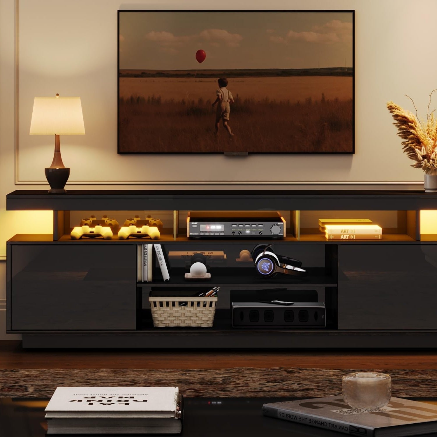 - 【Large Storage Space】ChooChoo LED TV stand has 5 open shelves where you can put DVDs, stereos, books, etc. The sides come with 2 large storage cabinets where you can put some miscellaneous items. Open and hidden storage space design makes your living room organized.