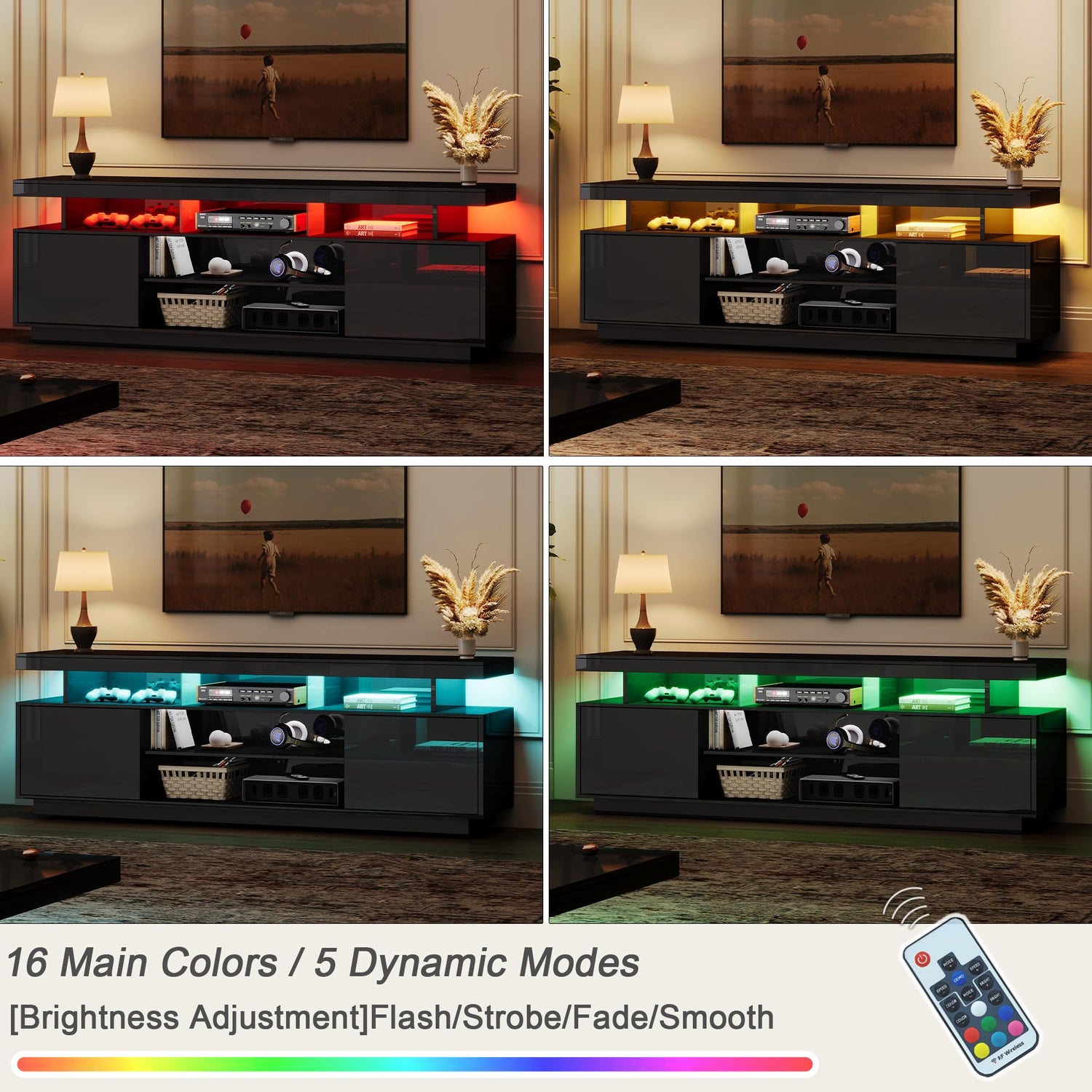 - 【16 Kinds of LED lights】This modern LED TV stand comes with 16 changeable LED lights and 4 flashing modes for a minimalist design with modern technology. You can customize the space and sense of atmosphere just for you by simply lying on the sofa with the remote control.