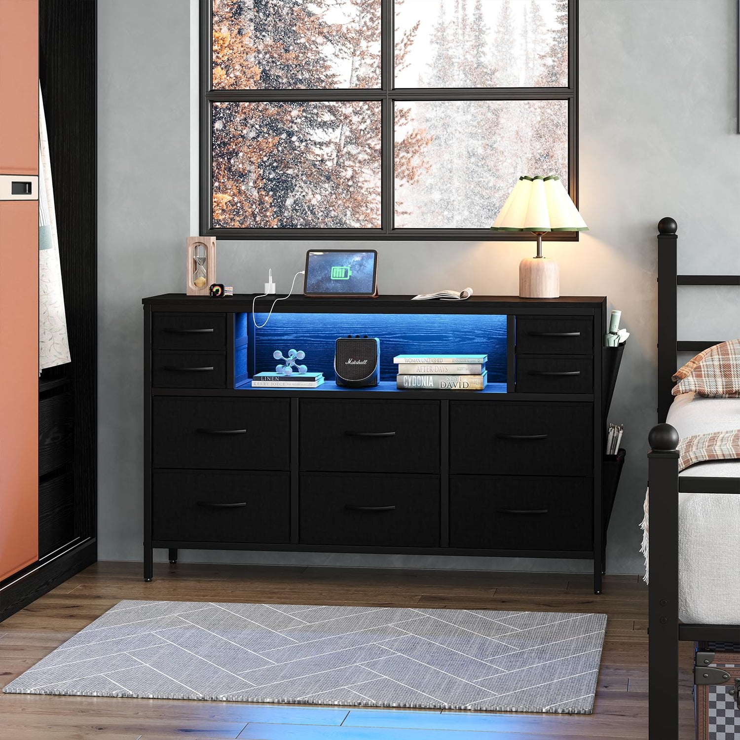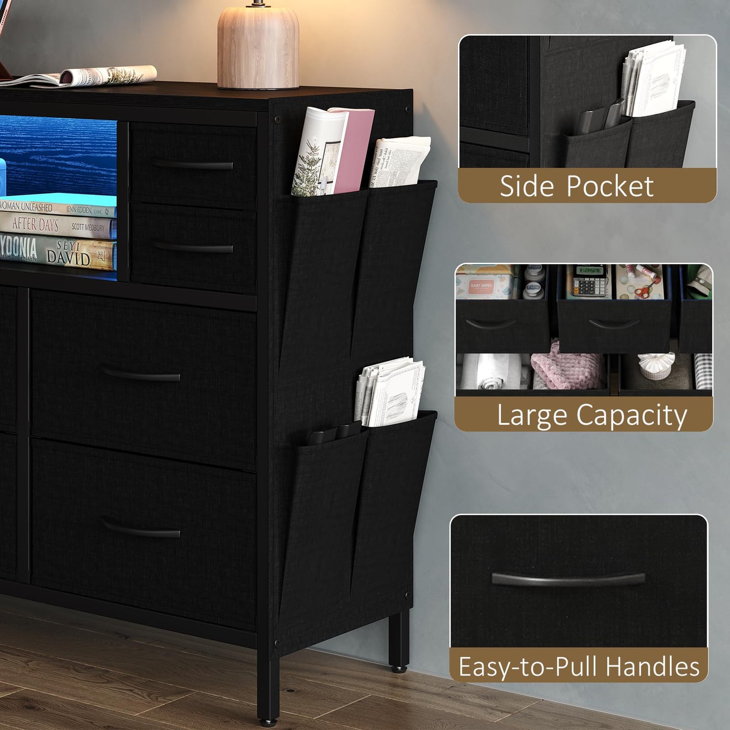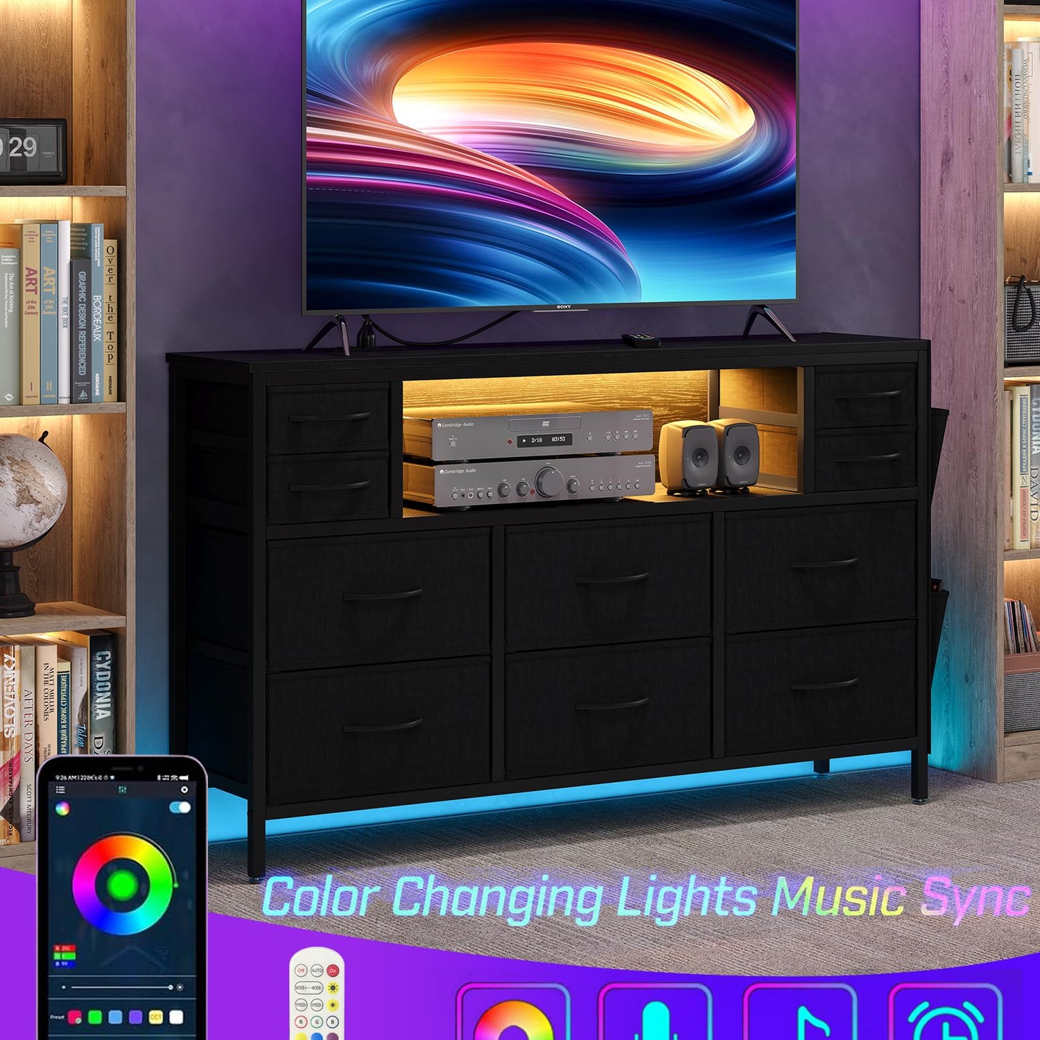 CollaredEagle 10-Drawer Dresser with Charging Station, Storage Drawers with LED, TV Stand for up to 55inch TV, Fabric Chest of Drawers for Closet, Living Room,Entryway, Bedroom, Black